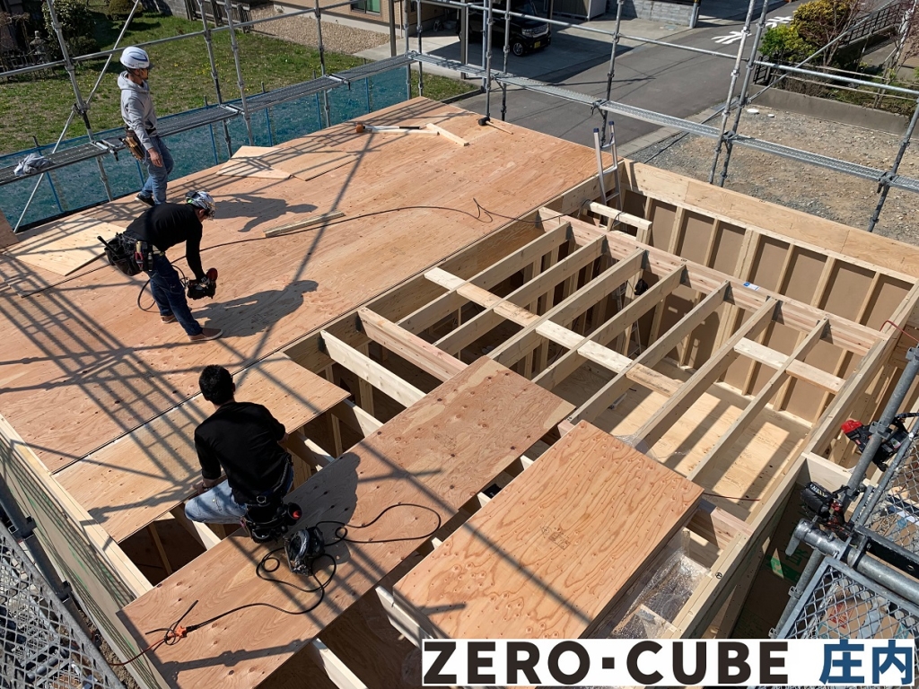 工場で組んだ壁パネルと床パネルをそれぞれ図面通りに組み上げて行くため、大幅な時間短縮に繋がっている。