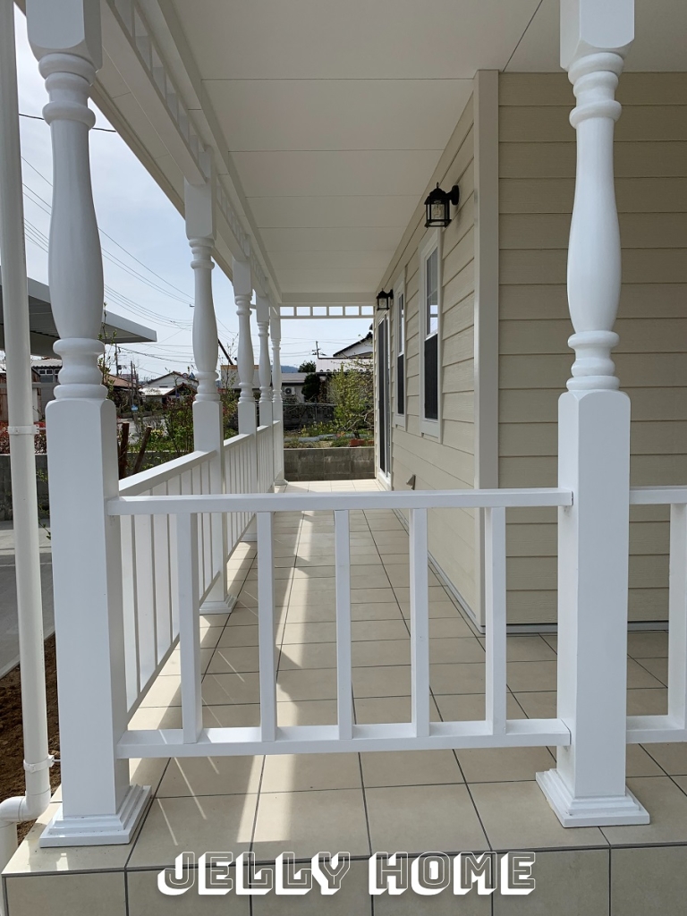 建物正面から見る外観が日本式の建物には無いアメリカンテイストの味わいと言うか、柱や手摺があることによって建物のデザイン性が増しているような感覚。