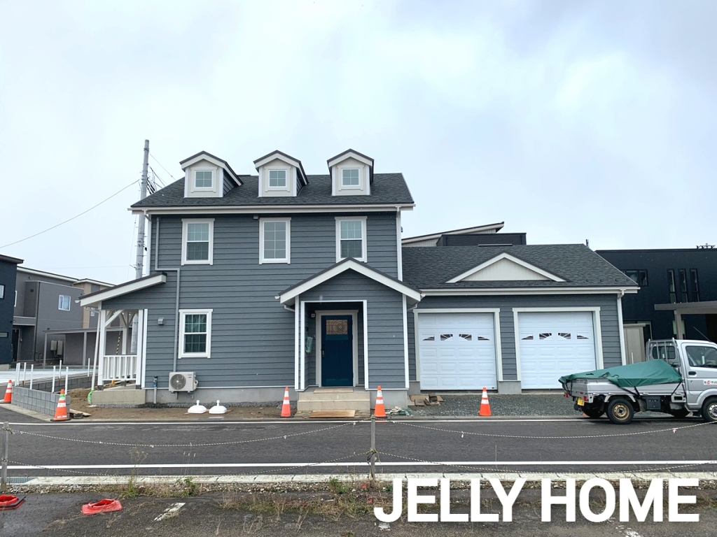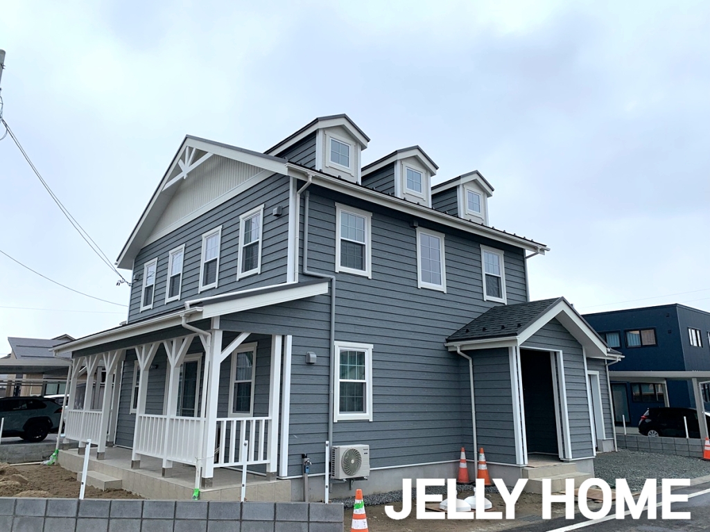 外観で特にこだわった点は、綺麗に並んだ窓配置や屋根上の3つのドーマー、カバードテラスのデザイン、そして、切妻部分の白い縦張りサイディングと妻飾り。