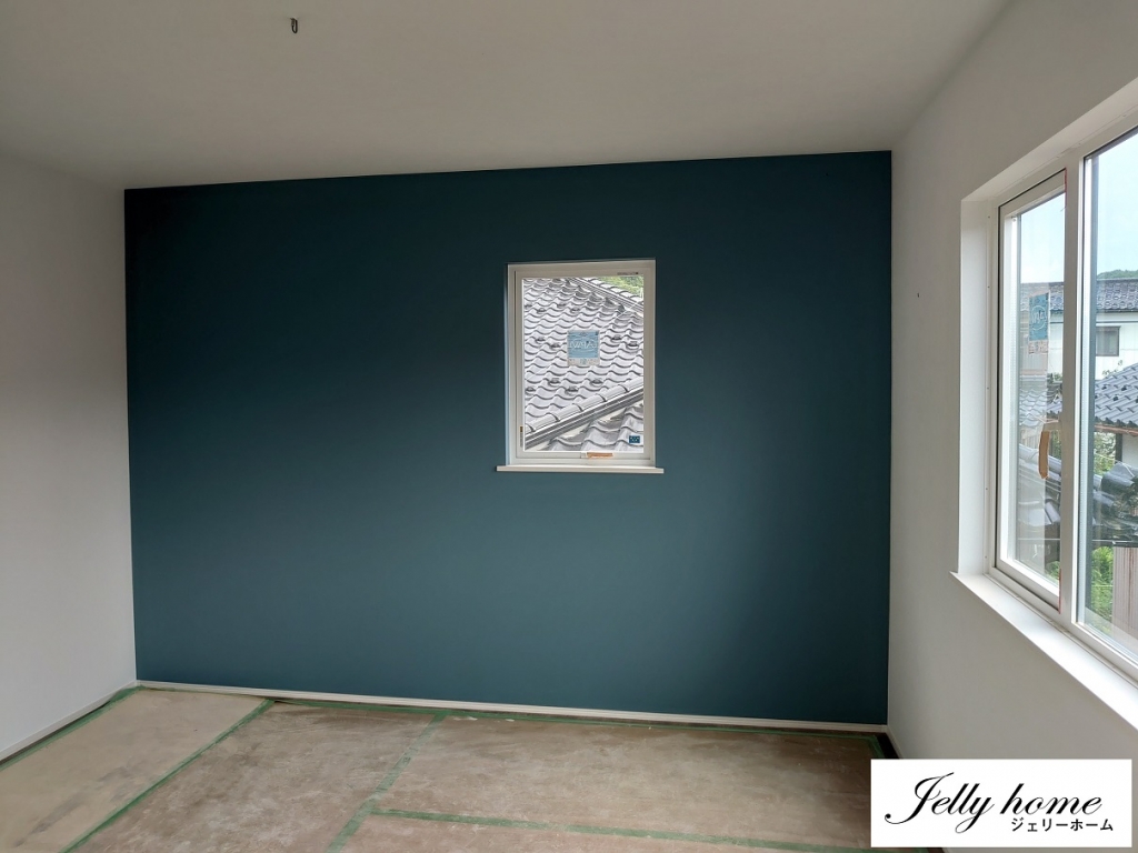 一転、寝室は深い青緑とし、外壁のモスグリーンに合わせたコーディネートが素晴らしく良い。