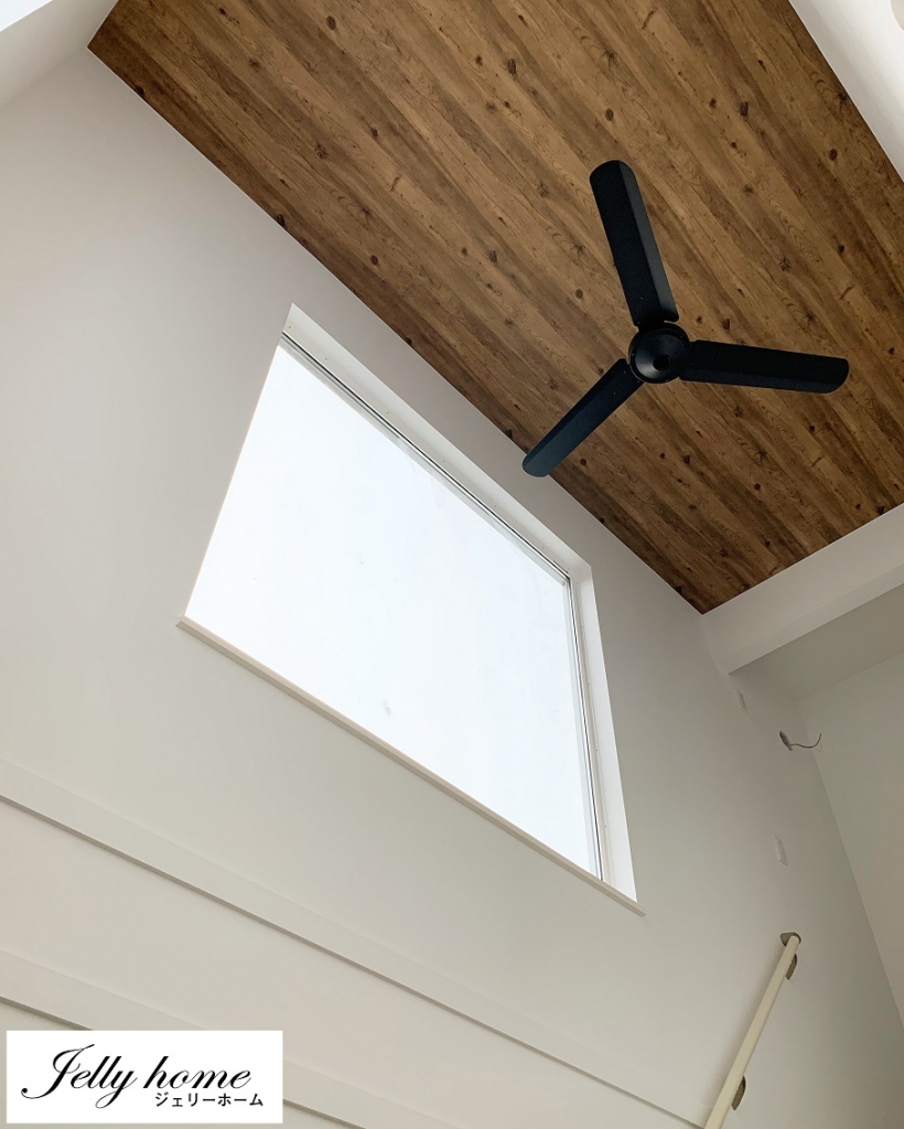 吹抜け天井は人気の木目柄にし、ブラックのシーリングファンがアクセントとなっている。