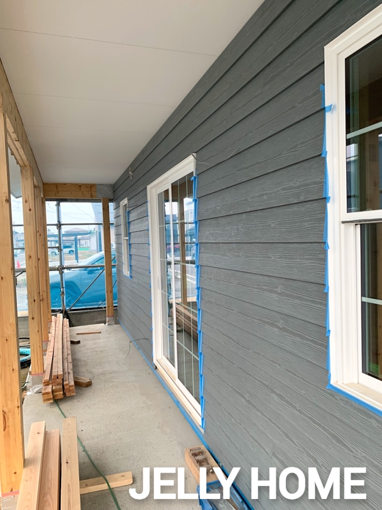 メーカーの品切れとかで入荷が遅くなり予定より遅くはなったが、待望のラップサイディングが貼られて、少しづつアメリカンスタイルが見えてきた。