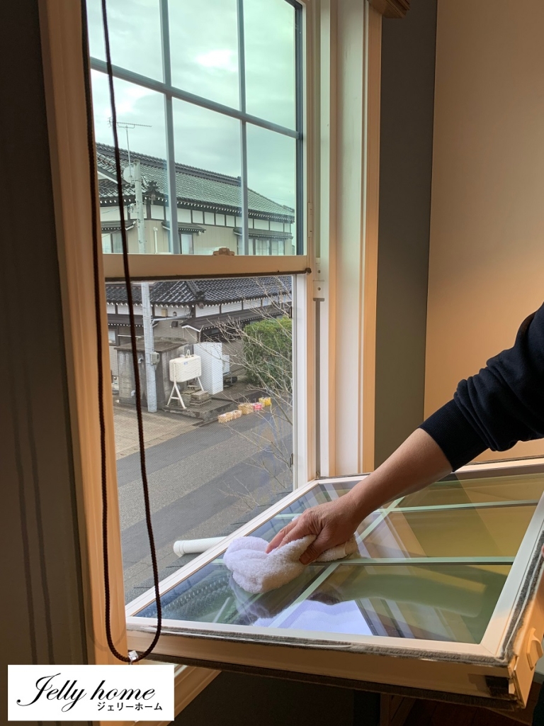 ②外側ガラス面の汚れを雑巾で拭き取る。