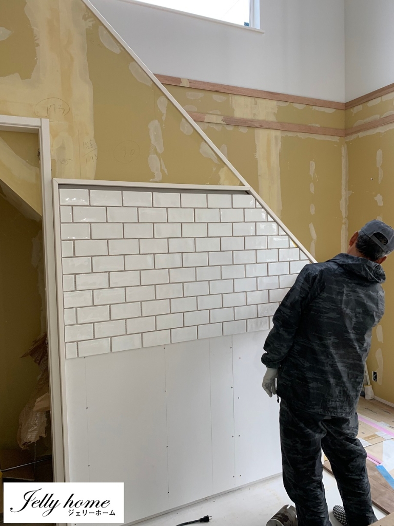 吹き抜けの真下に構える薪ストーブには、防火対策上の炉壁と路盤の設置が必要となるが、その炉壁用のタイル貼りは左官屋さんが施工中だ。