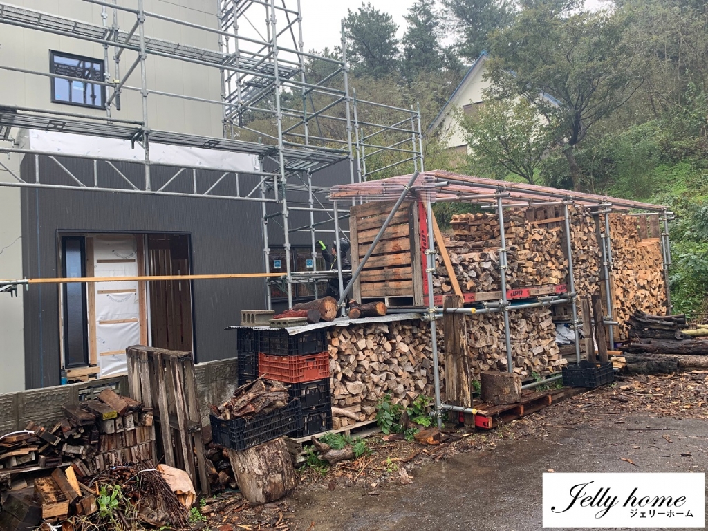 家の前には薪ストーブ用に施主様自身が薪割りしたと言う「薪」がこんもりと積んである。今年の冬に備えて準備万端です。
