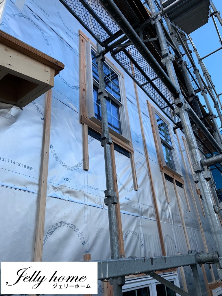 外壁の方はどうかと言うと、窓が全箇所取り付けられ、タイベックシートも張られ、胴縁材も取り付けられた。窓はトリプルガラスのサッシにタイベックシートはシルバー色の遮熱シートを採用している。(弊社標準仕様)