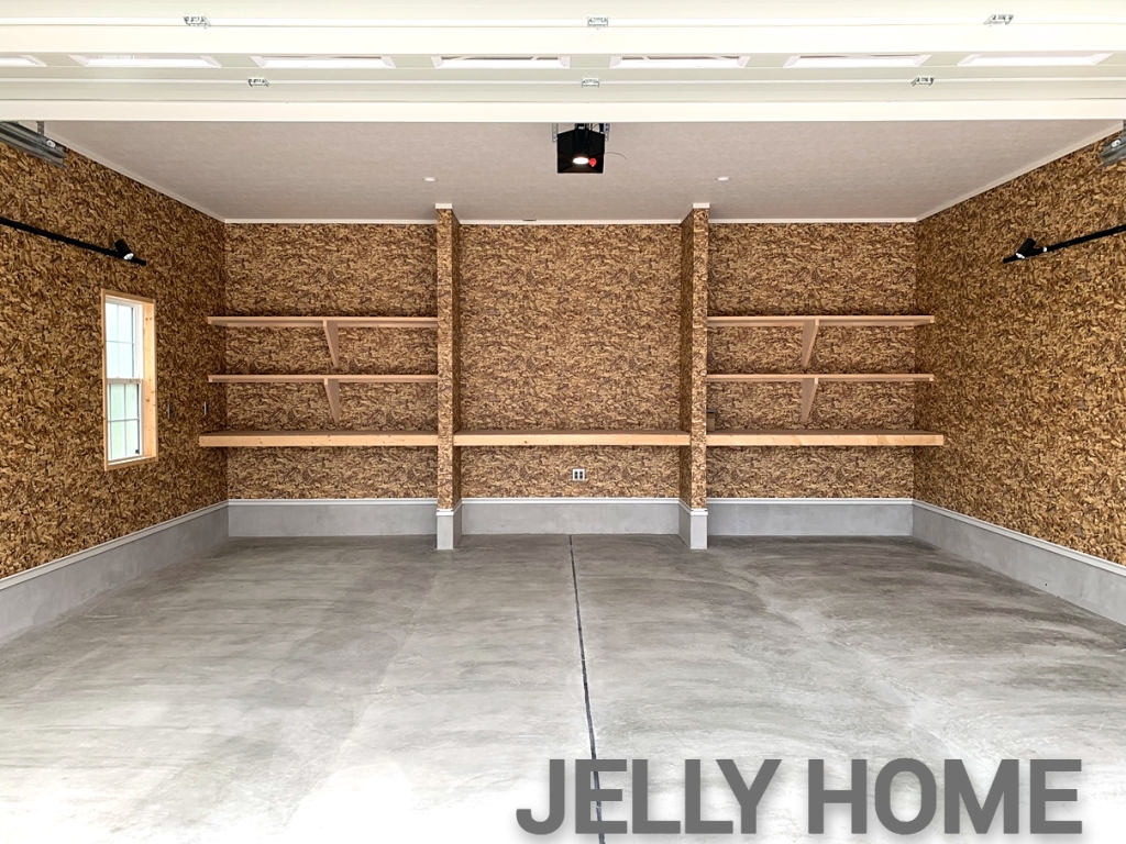 内装制限があるガレージ内部は板張りにできないため、壁天井は石こうボードの上から不燃クロスを貼って仕上げた。見た目的にはOSBボードそのものだ。