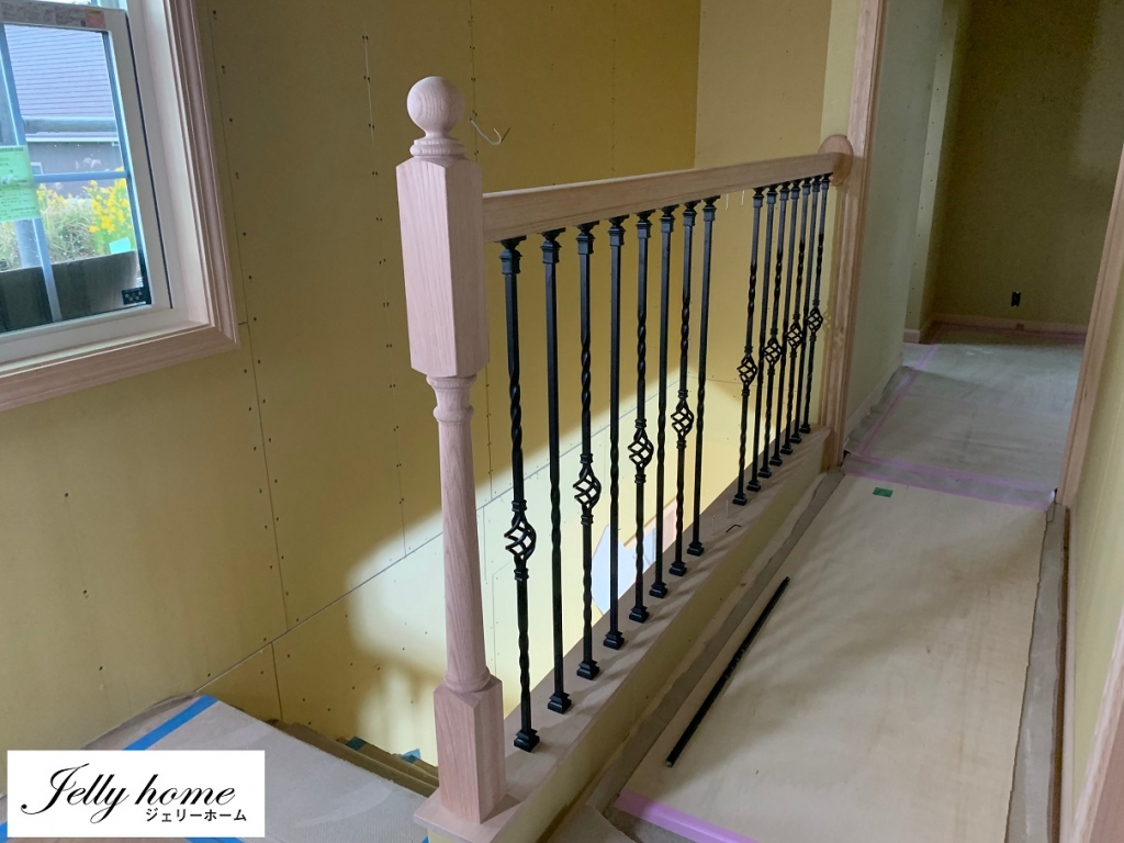 輸入住宅らしさが漂うこの階段手摺り、弊社「ジェリーホーム」ではとても人気があり、取付を希望するお客様が多い。