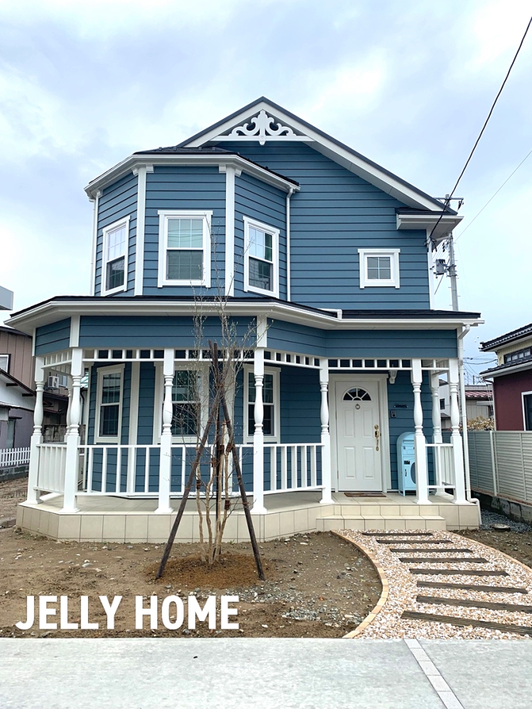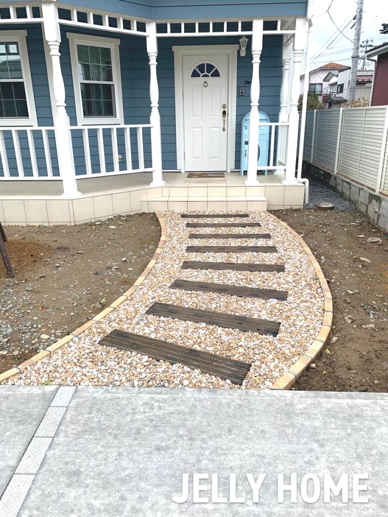 建物の外観は、ブルーのラップサイディングに白い窓枠や柱が映える、クラシカルで爽やかなアメリカンスタイル。そこにこのアプローチが加わることで、まるで映画のワンシーンのような玄関まわりが完成しました。