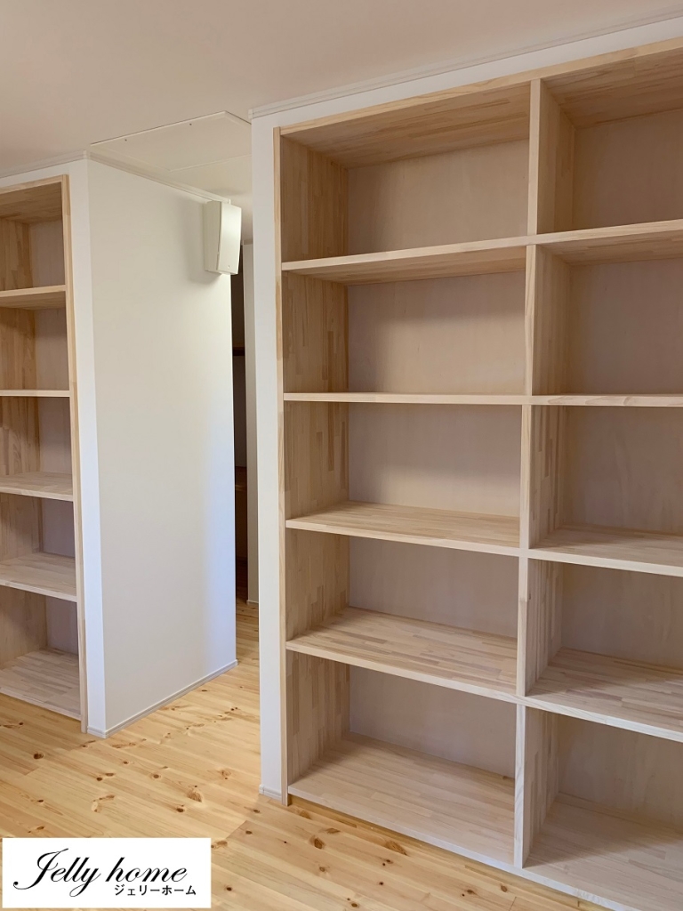 S様所有の大量の本を収納する本棚も作り、床材には母屋でも採用した赤松無垢材を採用した。