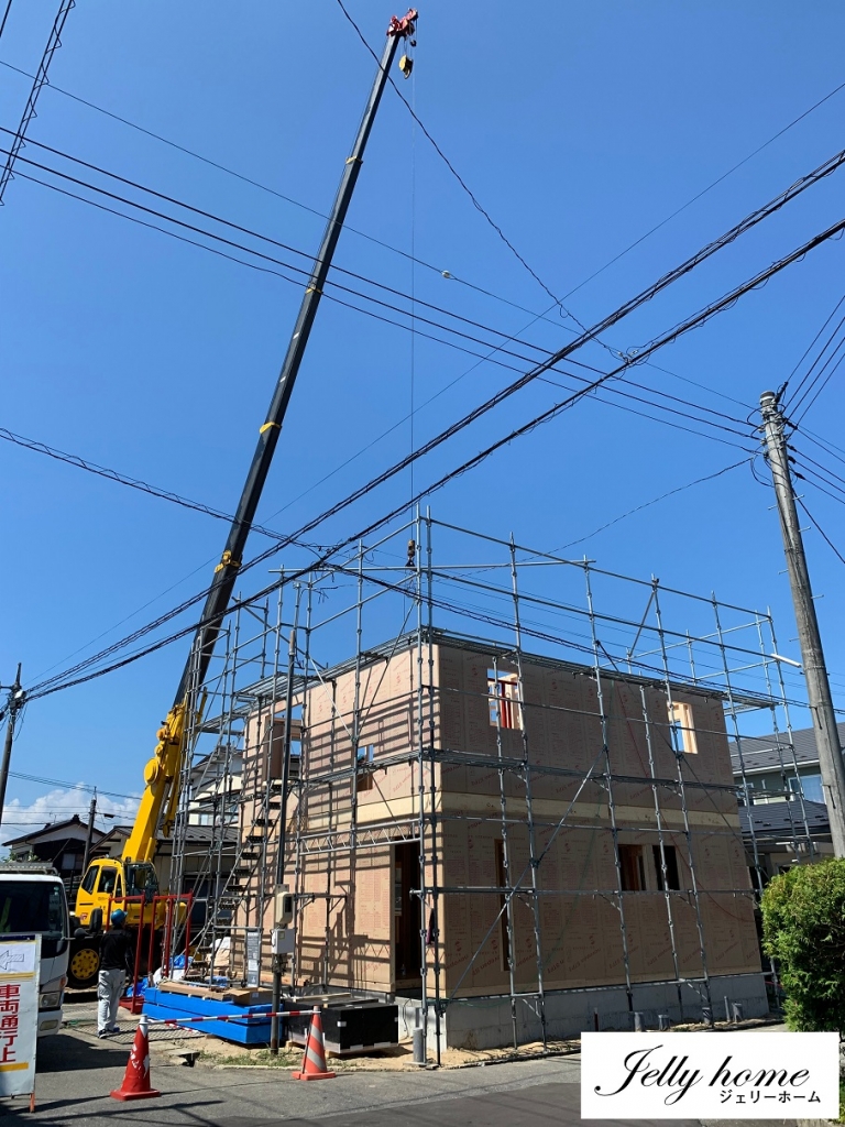 今週は週初めから40度近い酷暑が続いており、そんな最悪の状況の中でも東新斎町の「ZERO-CUBE+BOX」は建て方に入った。