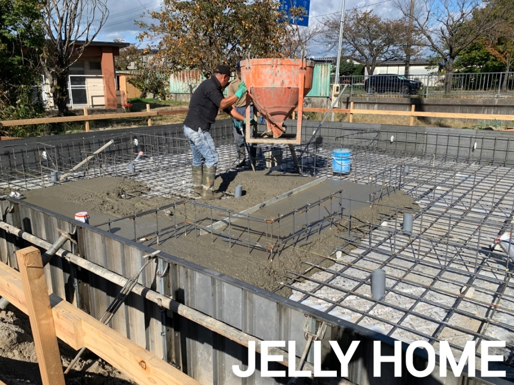 A様邸では配筋工事を終えて、今日は秋晴れの下でスラブの生コン打設。