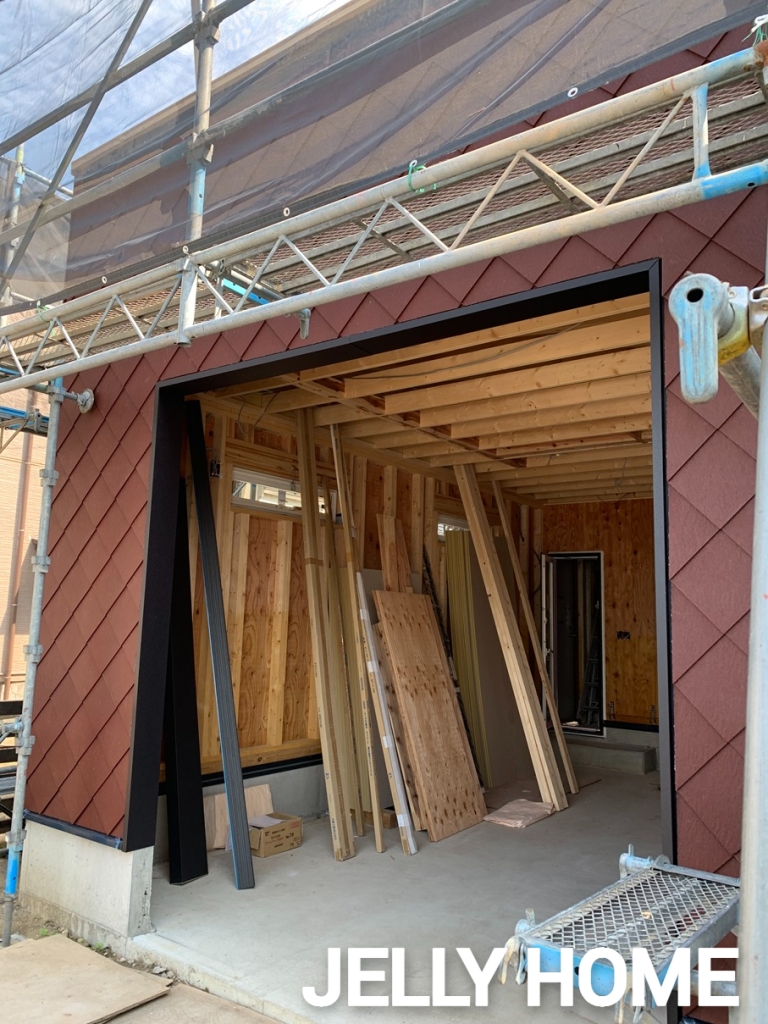 ブラック色の外壁にボルドーレッド色のガレージ壁がアクセントになり、出来上がってみれば、とても洒落た建物に・・・。