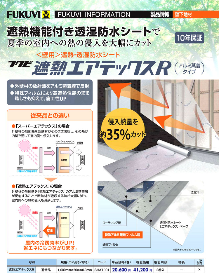 外壁材を張り付ける前に構造合板の上に巻き付ける防水シートを、当社では遮熱効果の高い「遮熱防水シート」を採用しています。