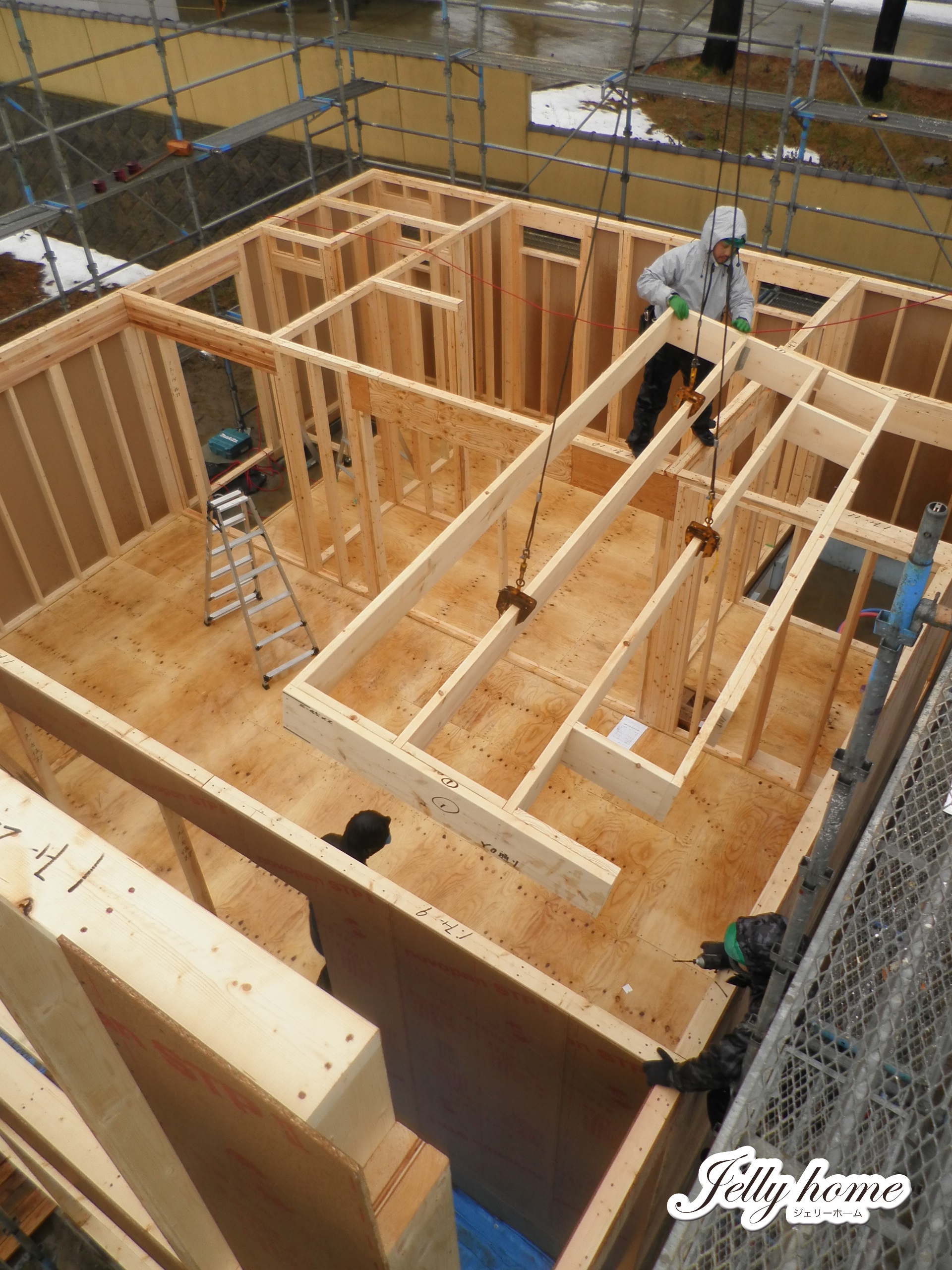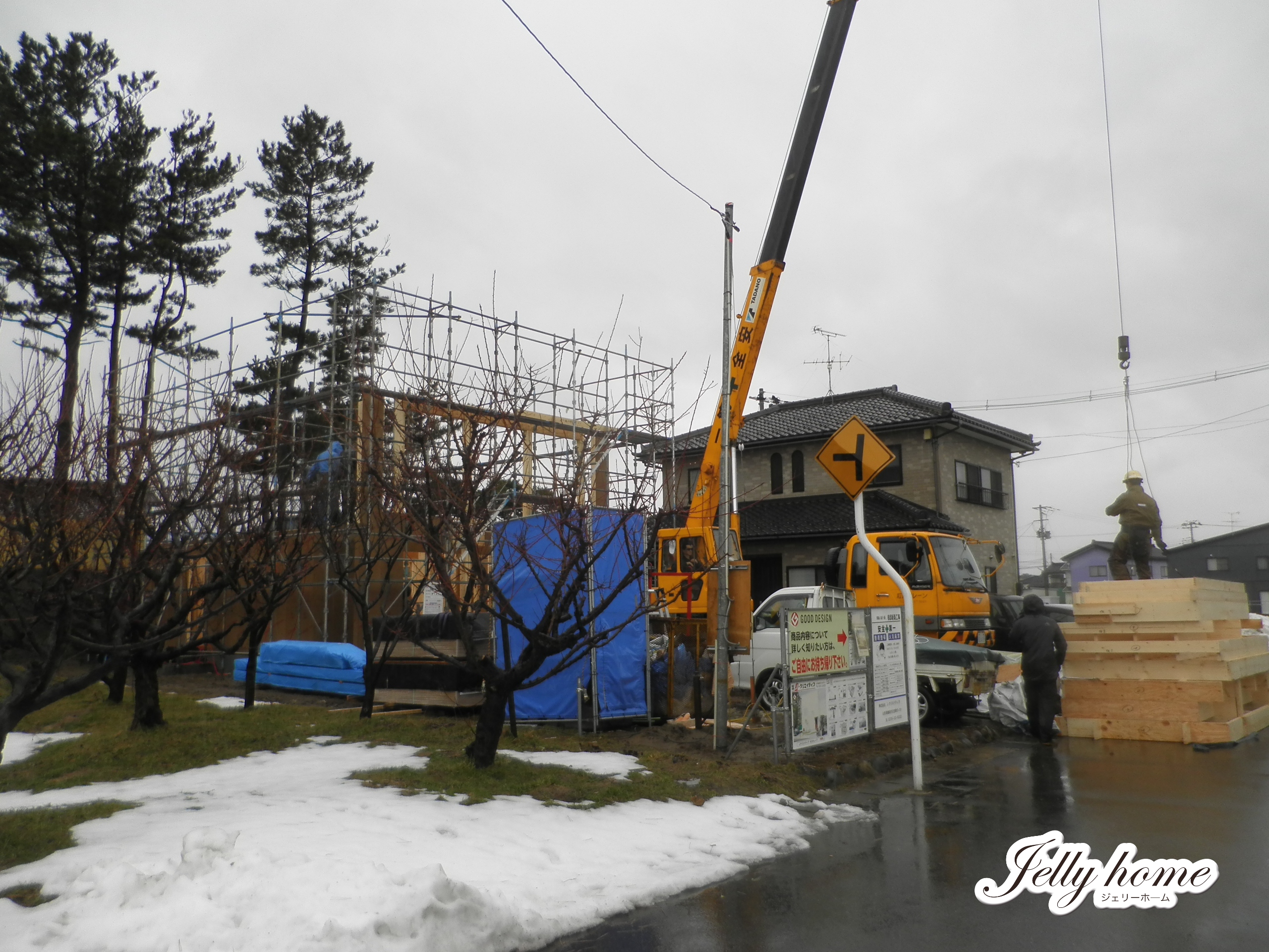 寒空の下、ゼロキューブ・マリブの建て方に入った。