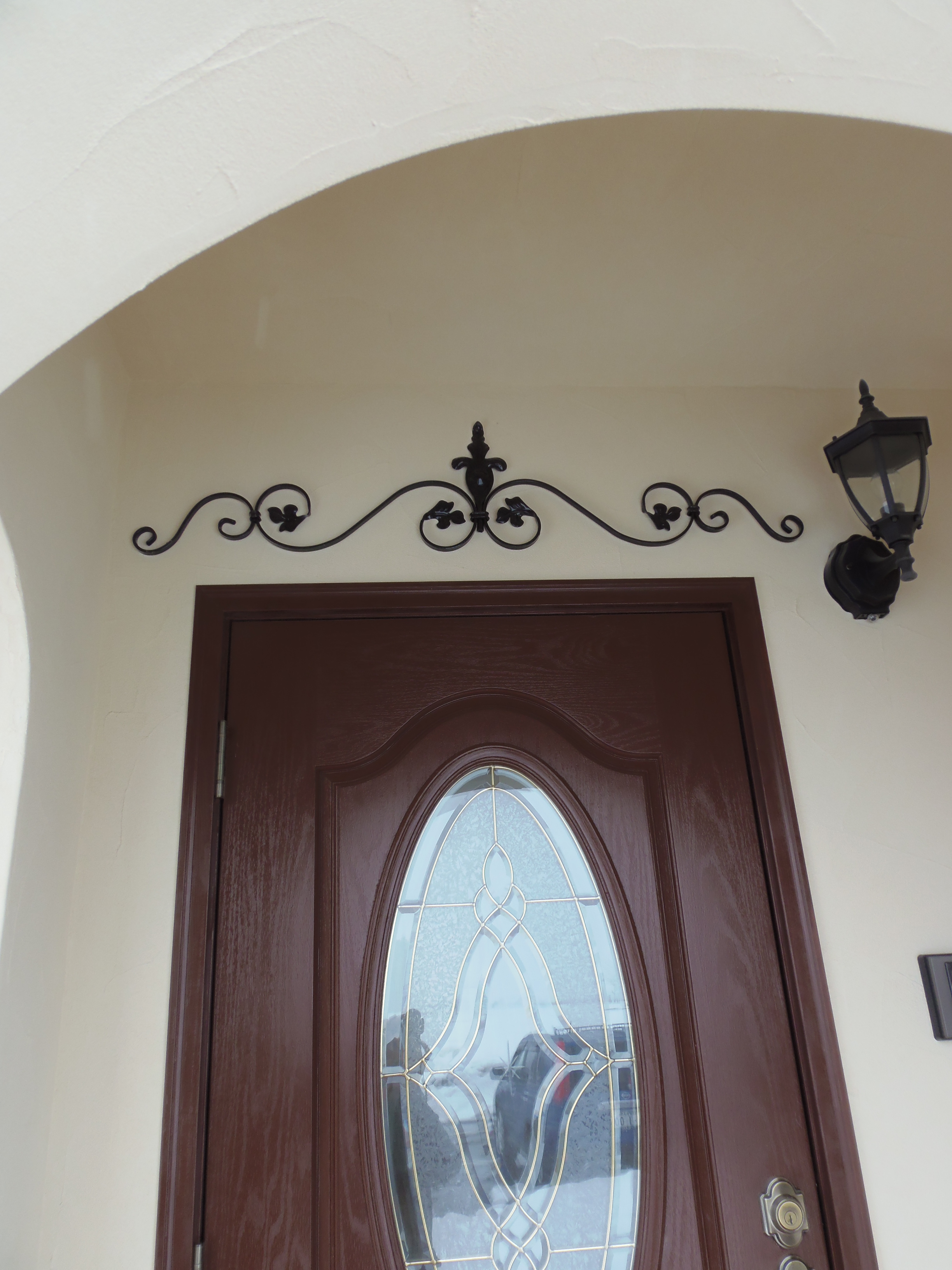 玄関ドア上に取り付けた飾りアイアンは、プロヴァンスの家にはぴったりのアイテム。