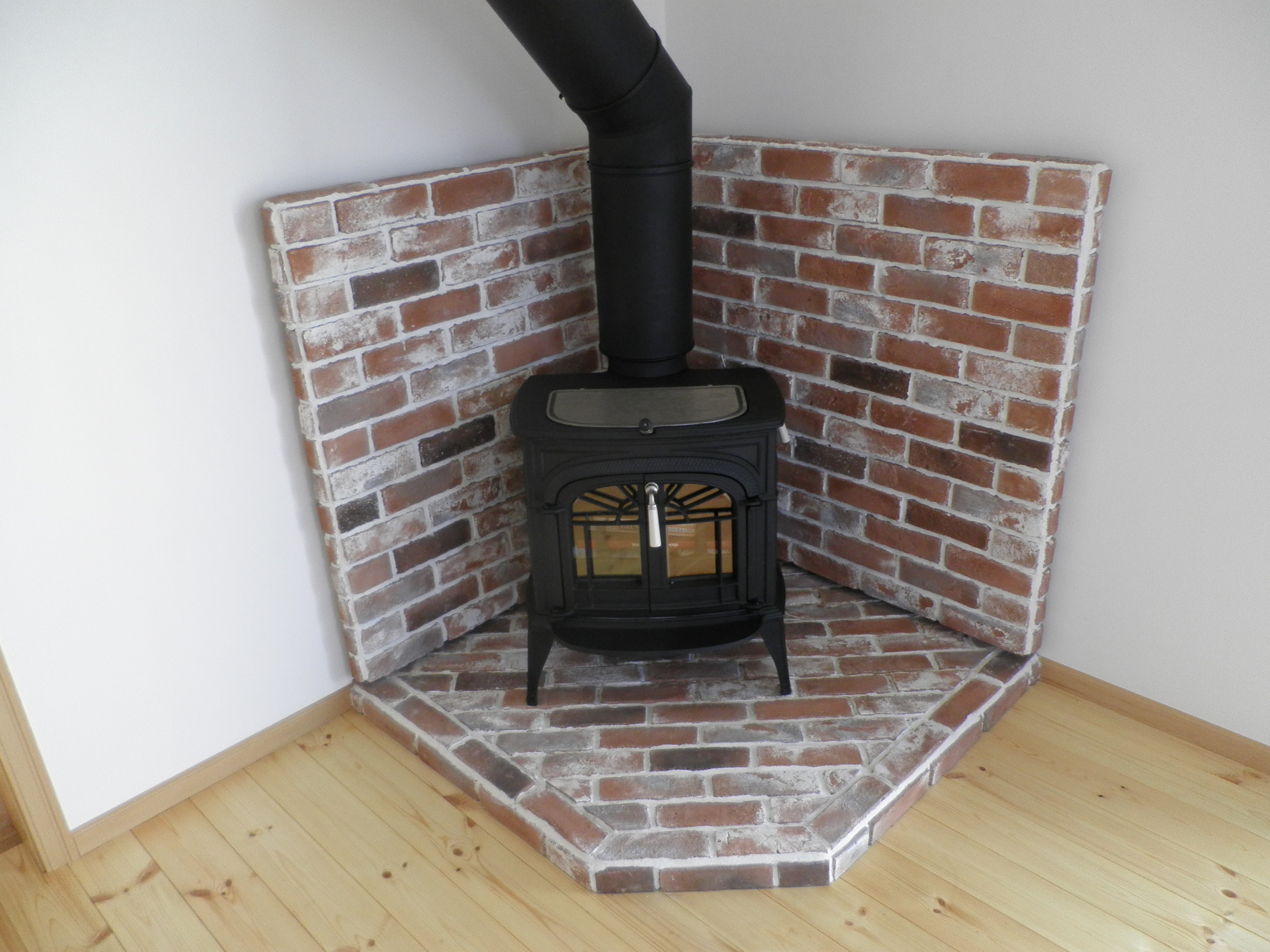 炉台と炉壁は現場で下地を作り、アンティーク調のレンガを貼り付けた。