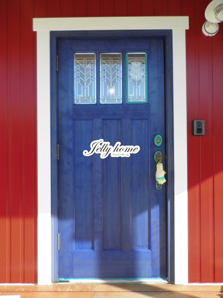 赤い外壁と青い玄関ドア、全く正反対の色同士だが、