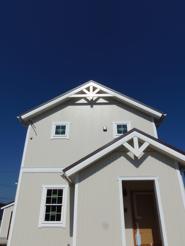 正面側の外観は切妻の妻飾りを二重に付けて、お洒落な装いに仕上げた。