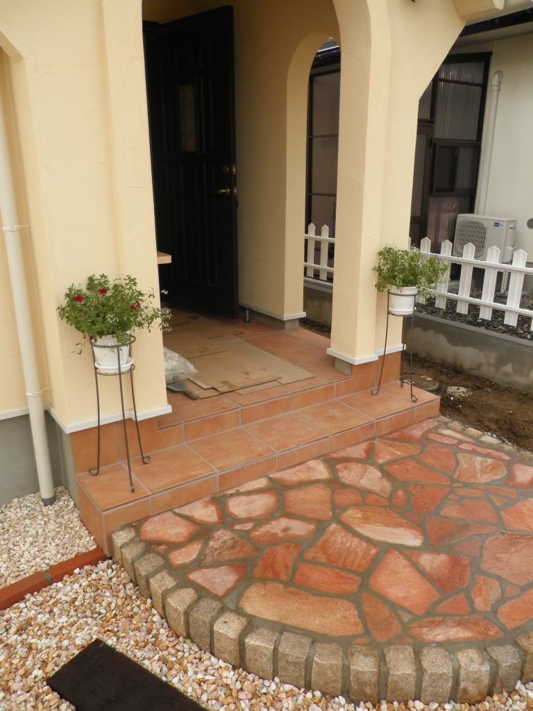 玄関ポーチ前には乱型石材を埋め込み、R状のピンコロ石が階段となって