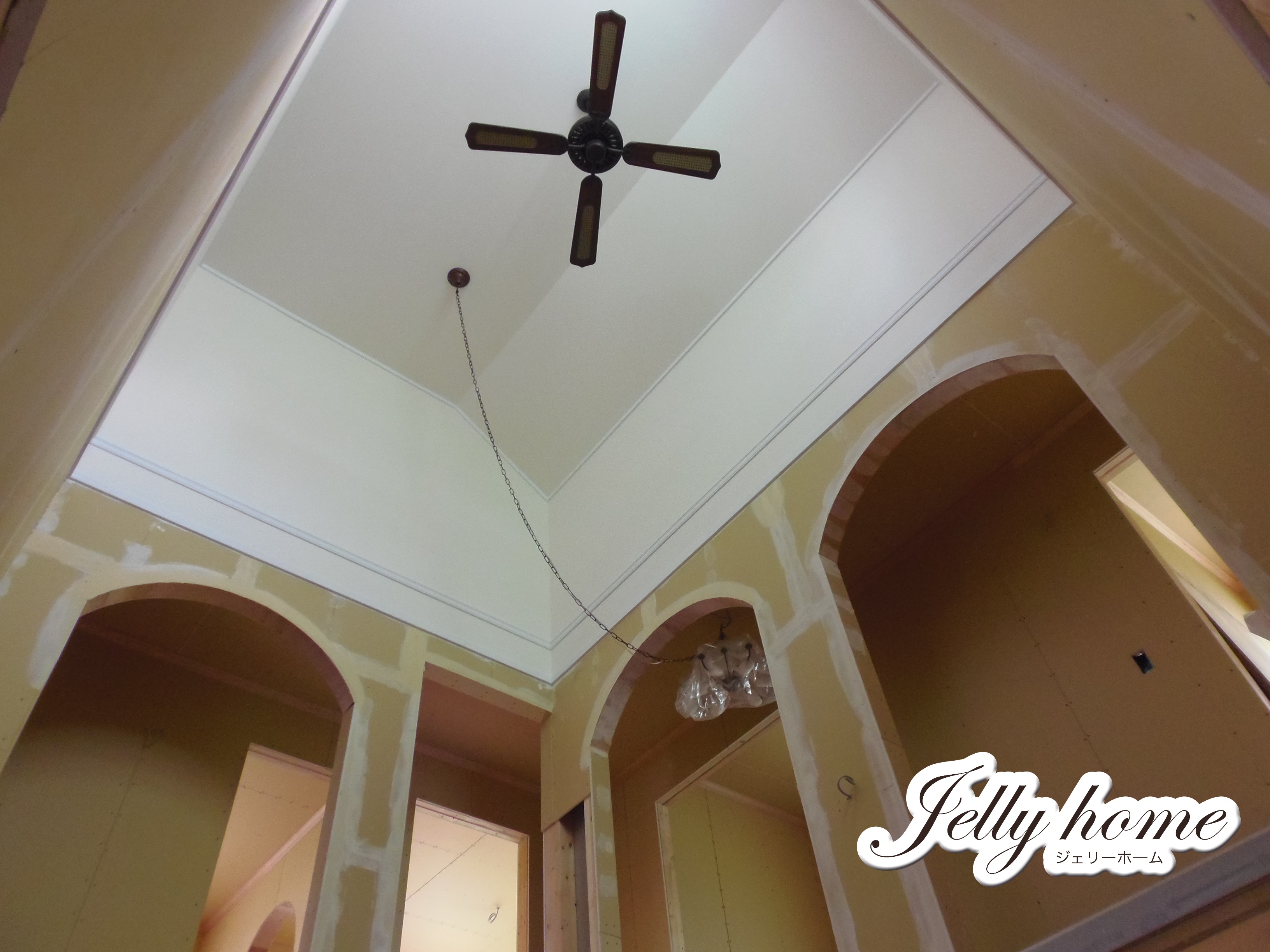 リビング上の大きな吹抜けには天井ファンとシャンデリアが取り付けられ、