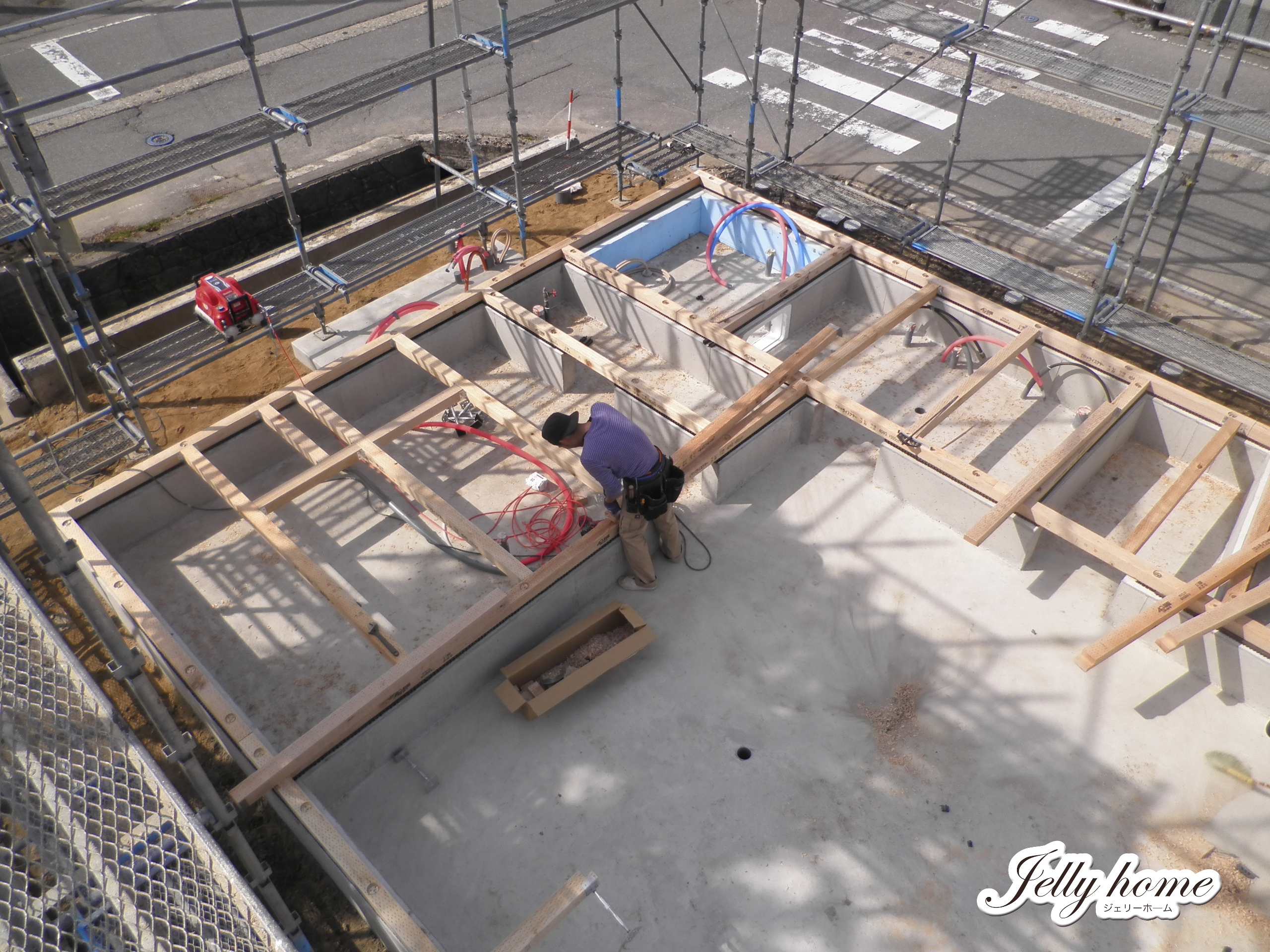 土台敷きから始まる建て方は、屋根が上がるまで3日掛かる。