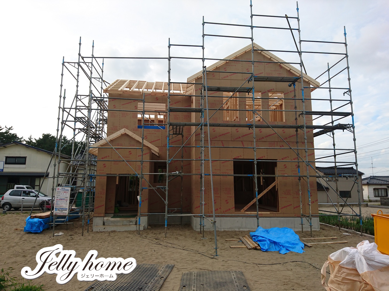 建て方開始より3日目で、早くも外観スタイルが現れた。