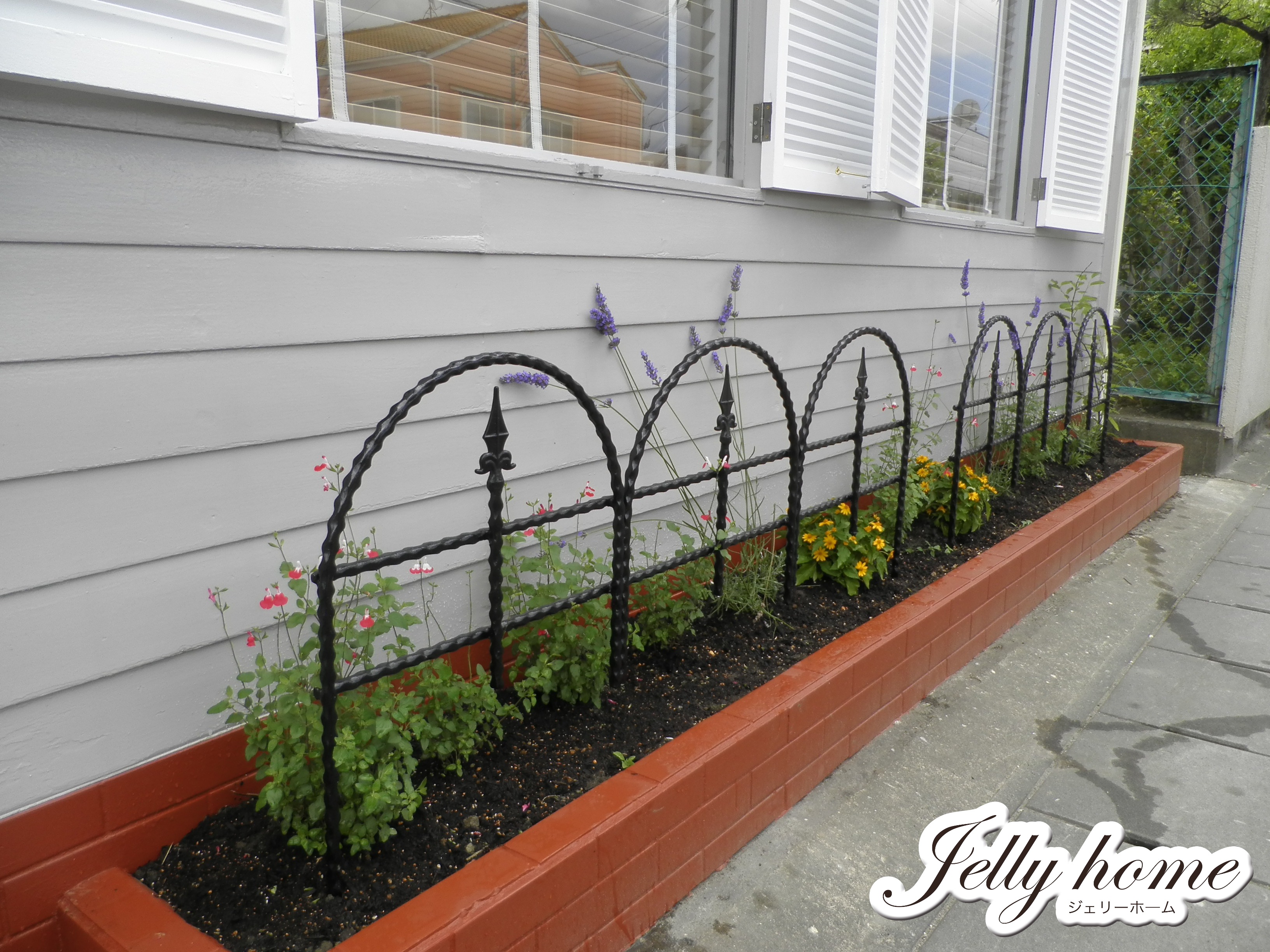 事務所前の花壇にはロートアイアンのフェンスを取り付けて花を植えてみました。