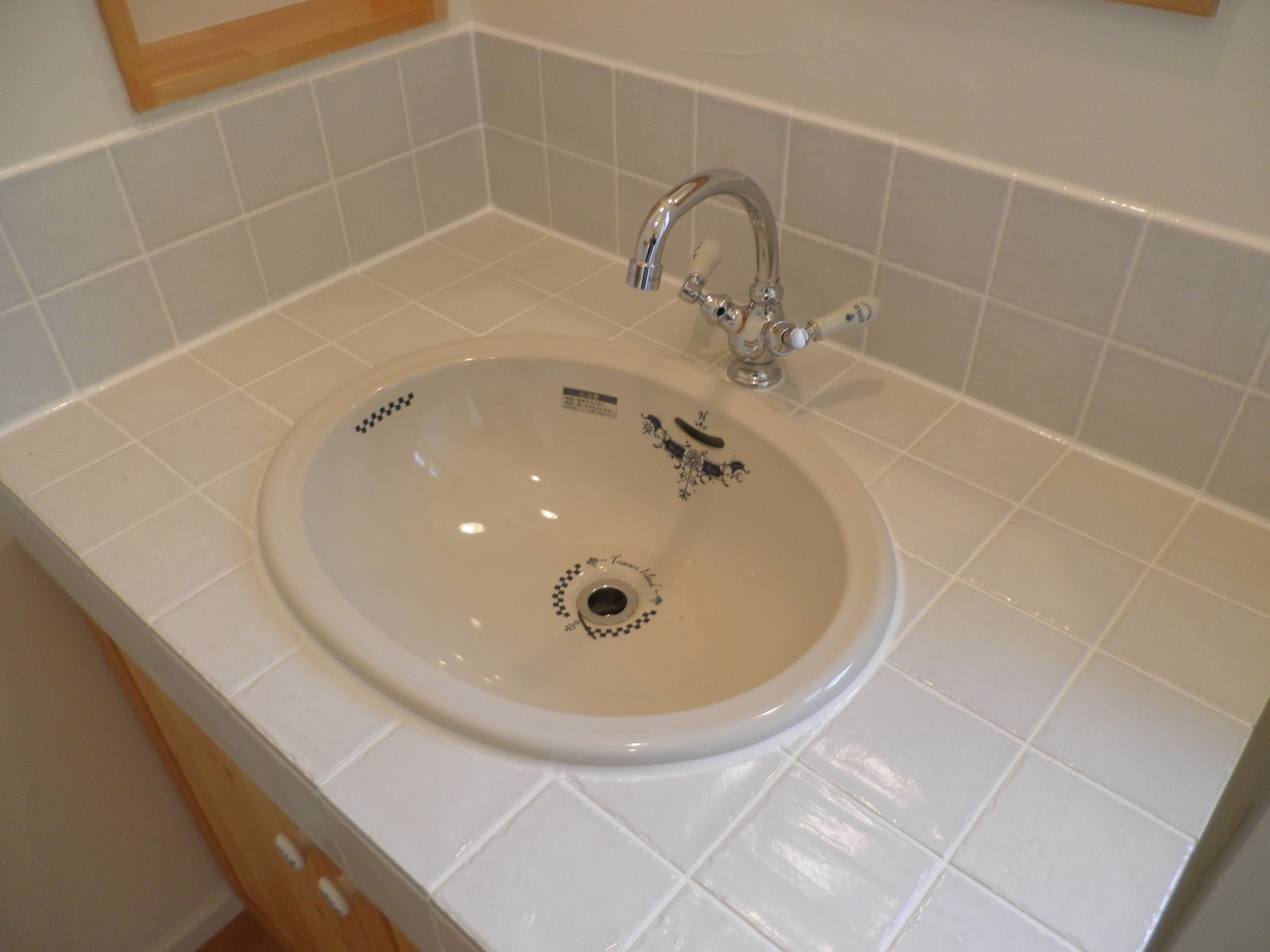 絵柄が素敵なボウルとグースネックの水栓、どちらもいつも使っている輸入メーカーの物で、