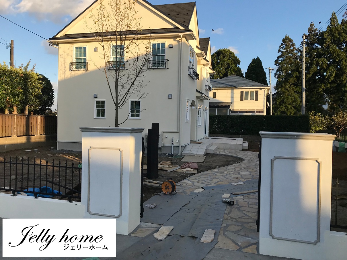 鋳物フェンスが取り付けられ、門柱も立派に出来上がった。