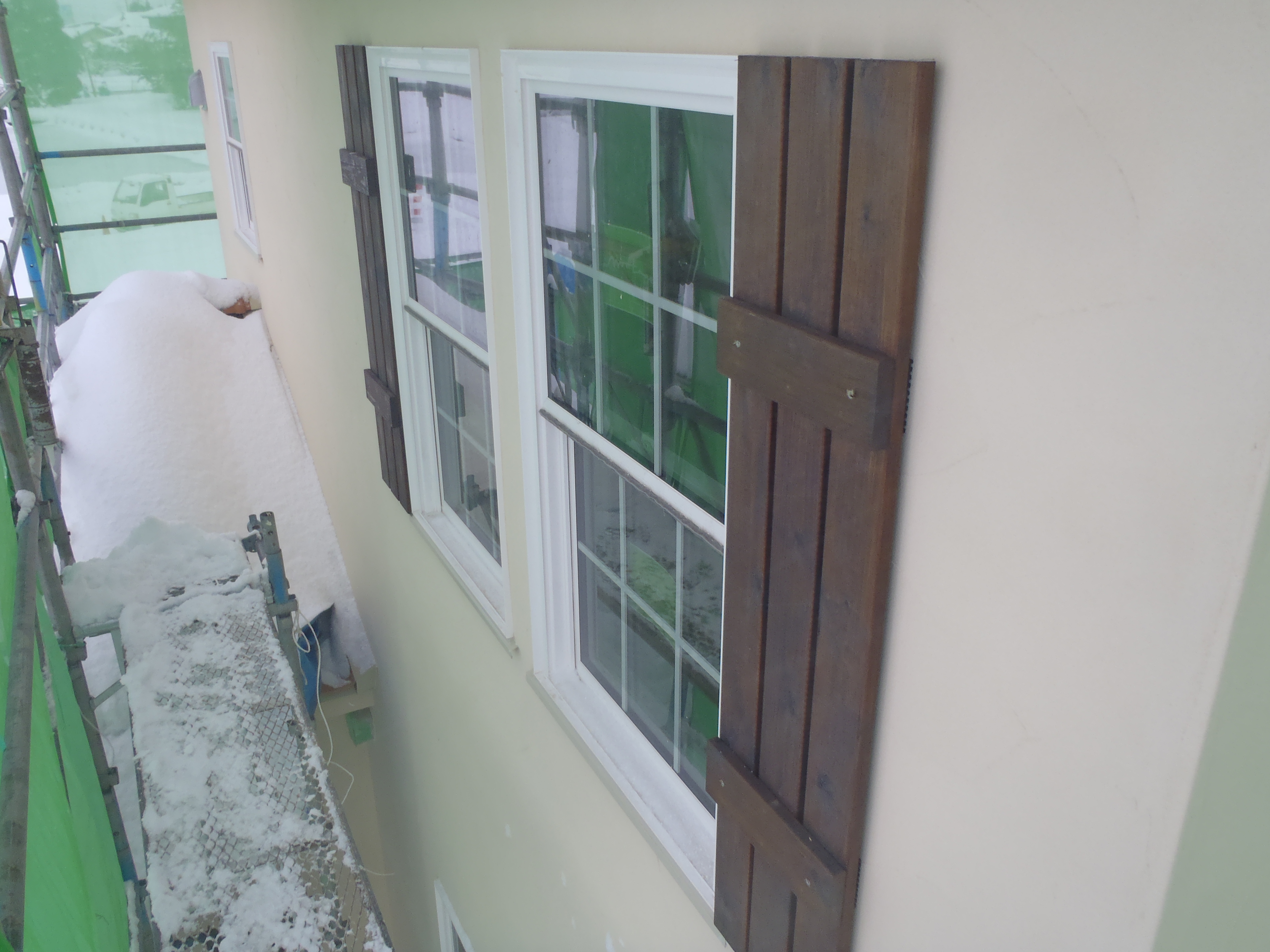 現場で作った木製飾り雨戸を今日取り付けてもらい、外周りも最終段階に入ってきた。