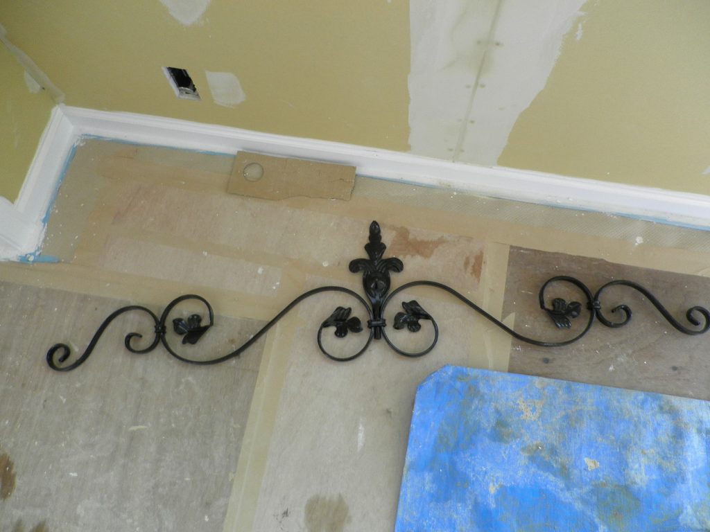 玄関ドア上の壁に取り付け予定の飾りアイアンも塗装が完了し、既にスタンバイが整っている。