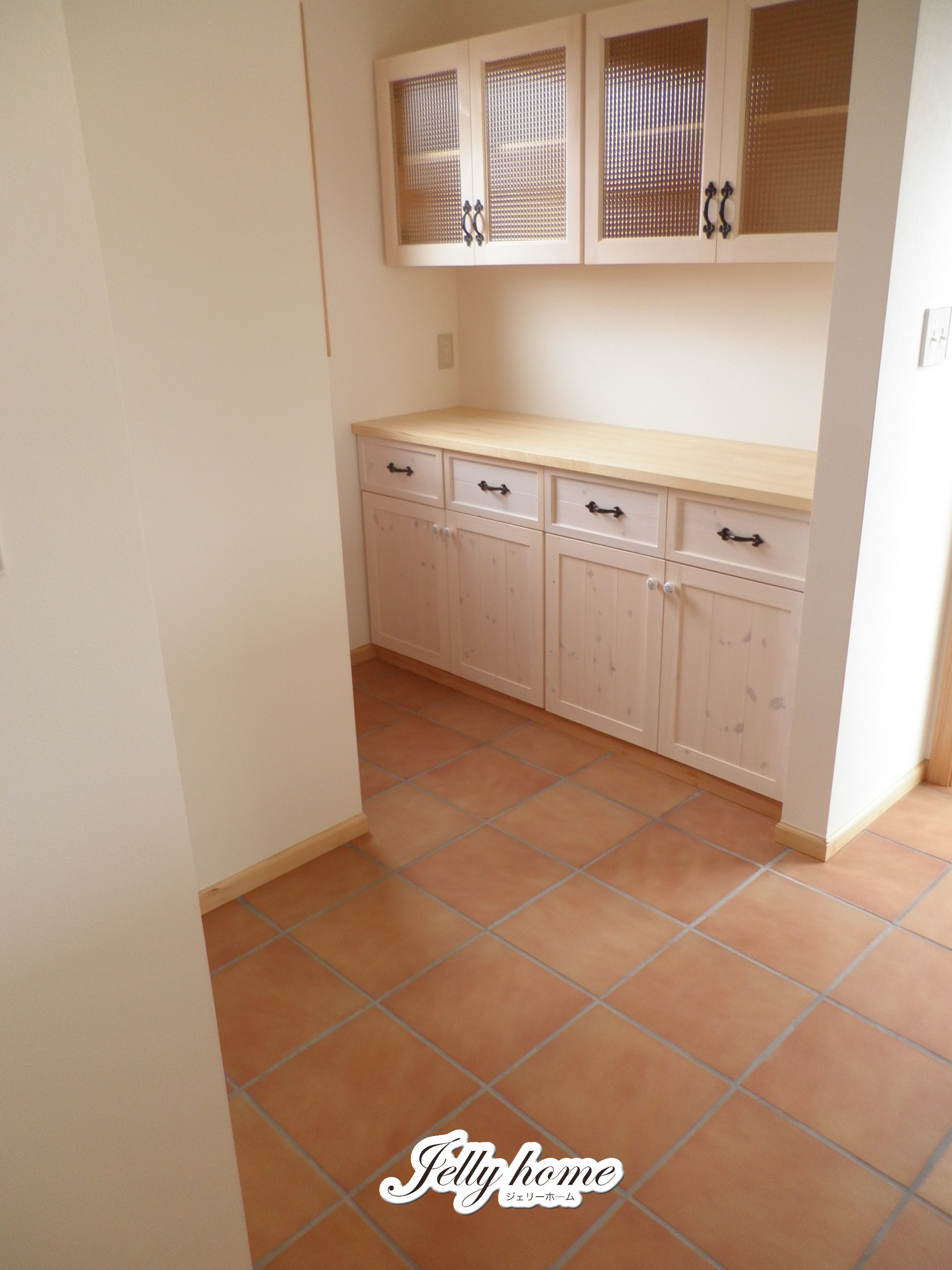 床は深みのあるテラコッタで仕上げて、メリハリを付けてみた。