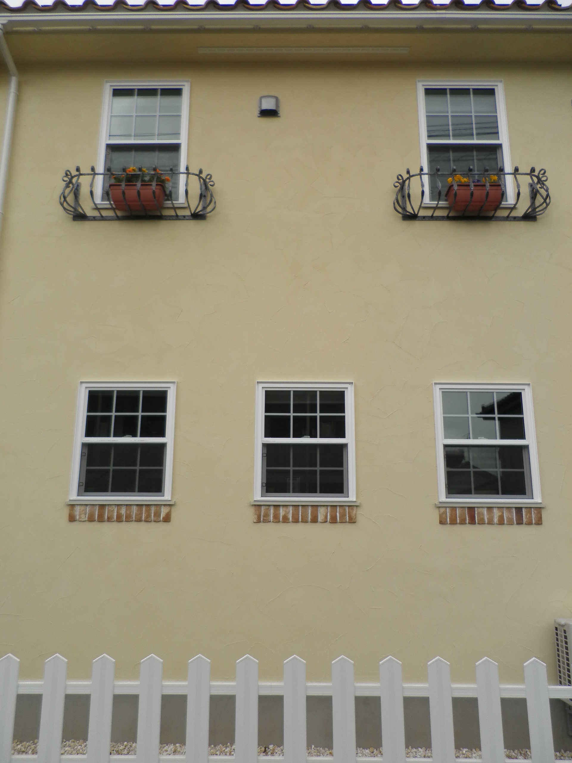 二階窓下に取り付けたロートアイアンの花台、