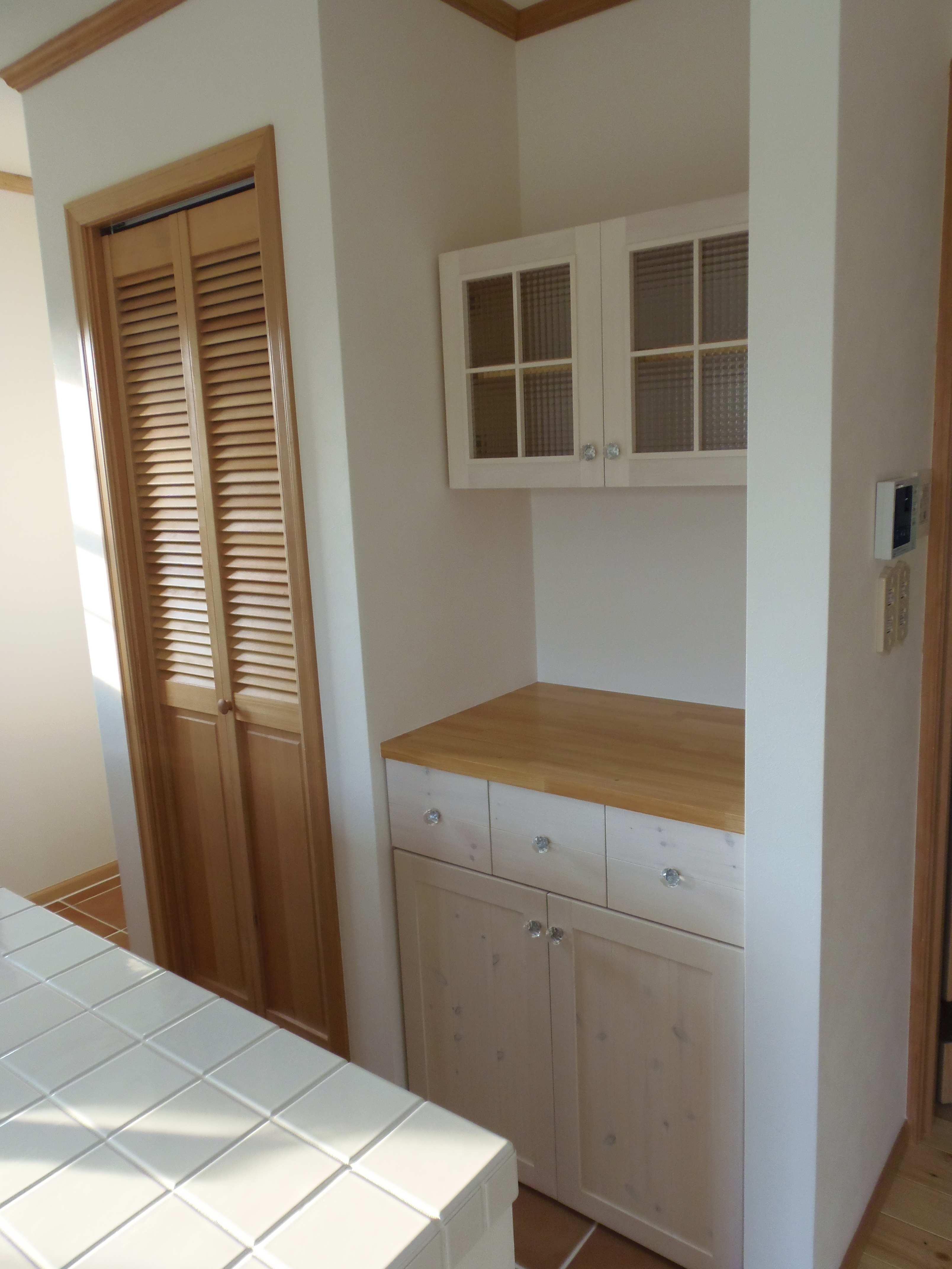 食器棚の扉は赤松材で作り、リボスの白塗装を施して仕上げた。