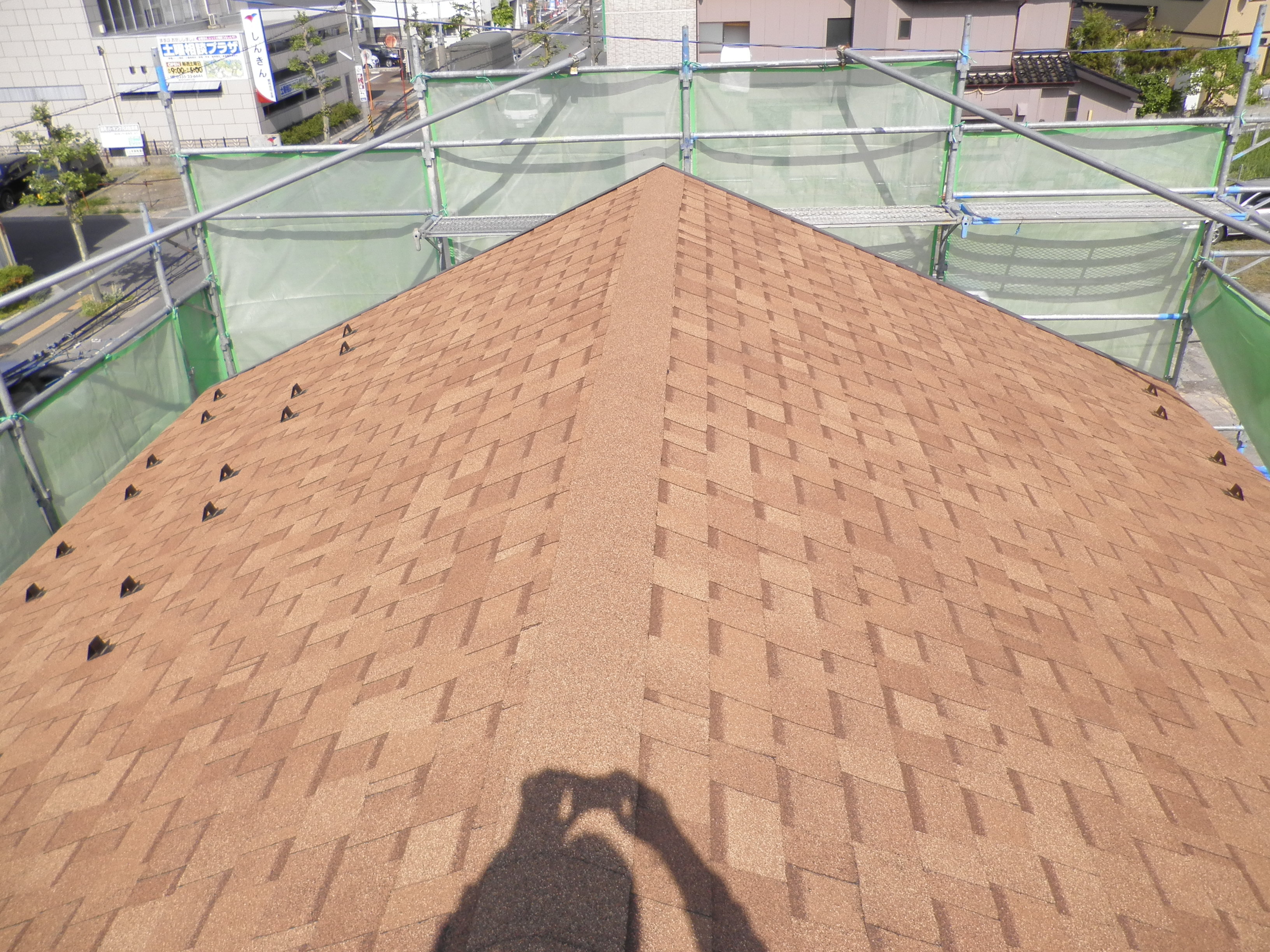 リフォーム現場の屋根が出来上がり、足場伝いに屋根に登って写真をパチリ。