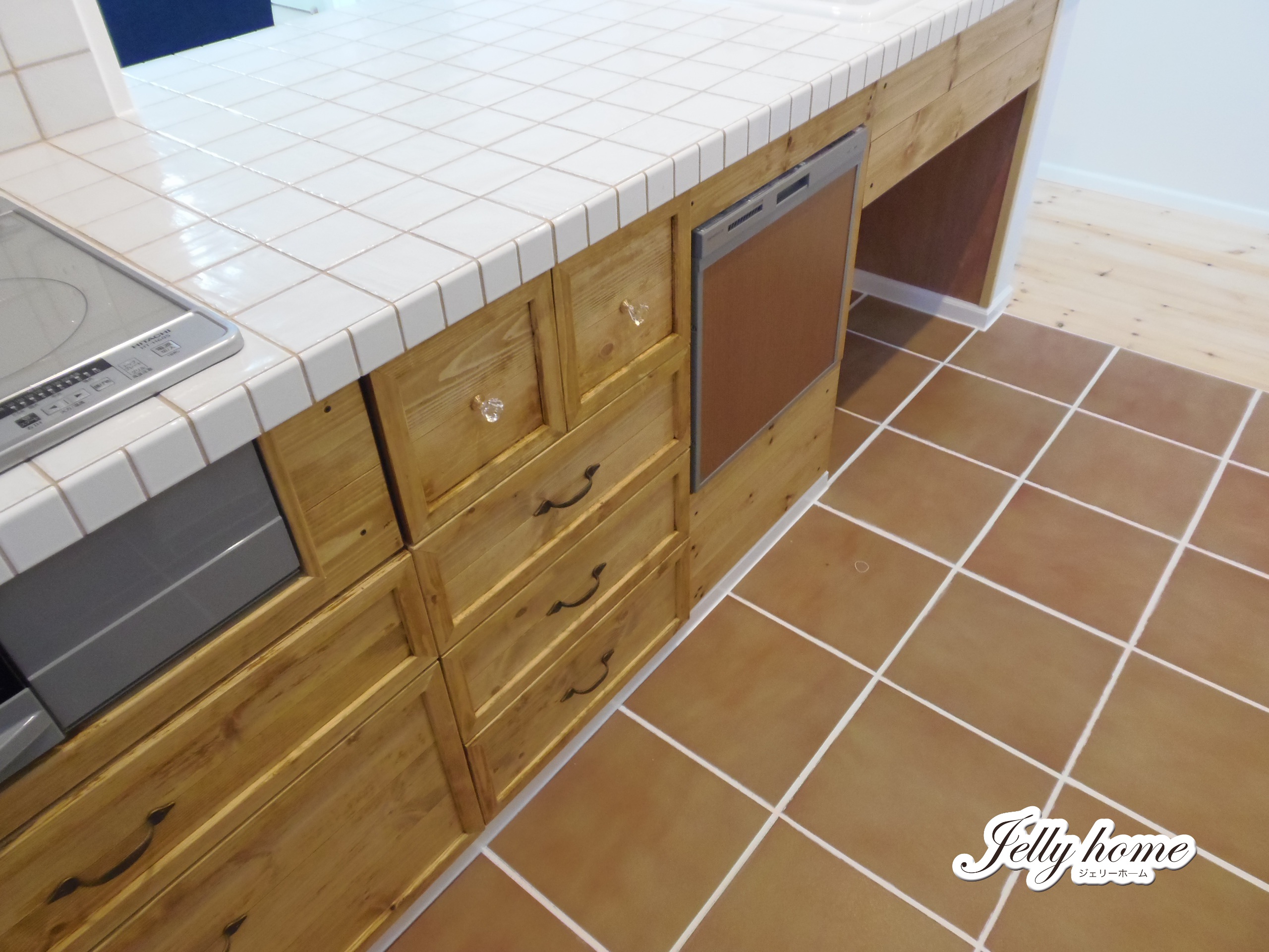 床はいつものテラコッタを貼り、目地は白で決めて、