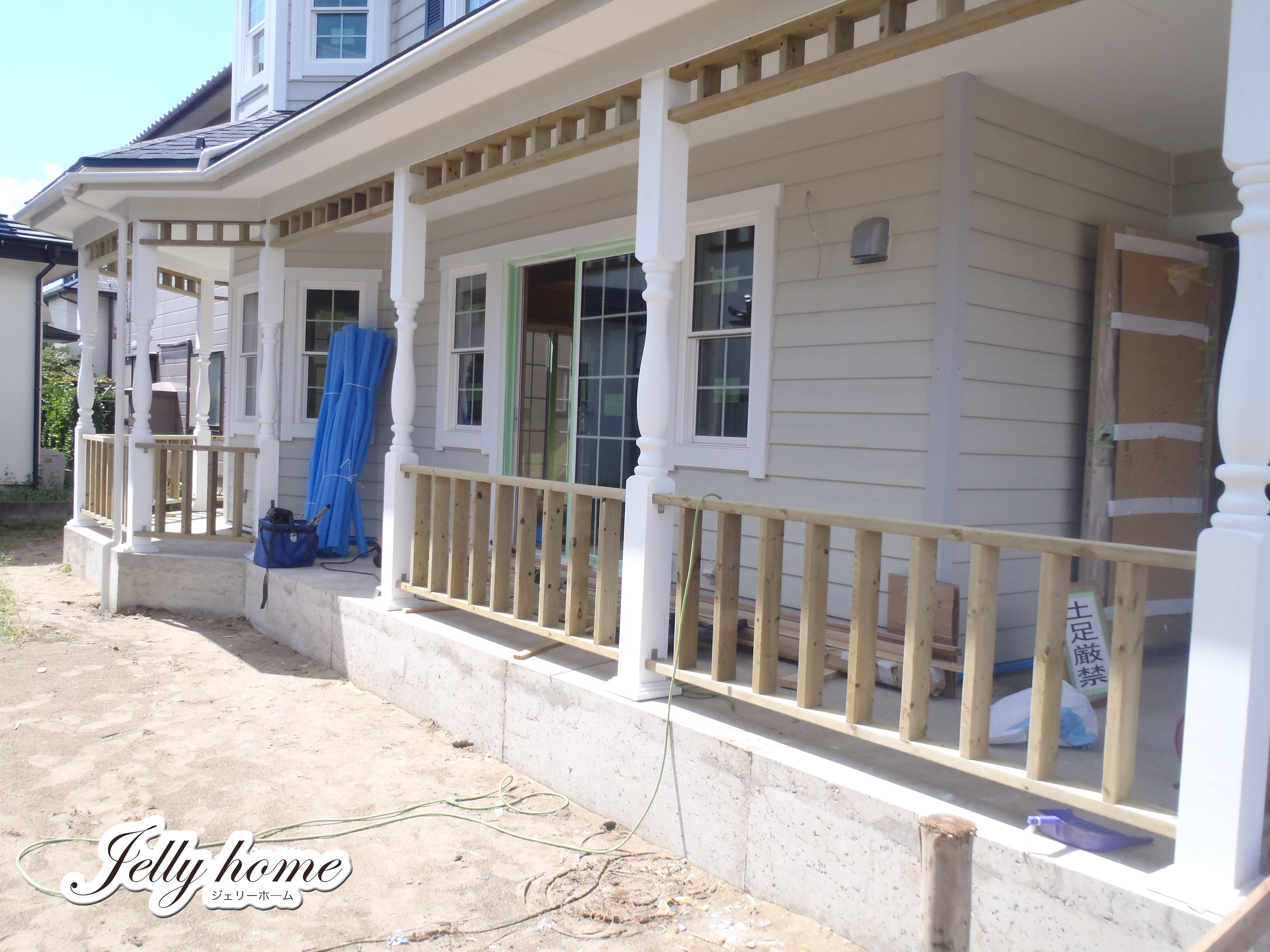 カバードポーチの手擦りを取り付けたY様邸は、段々とアメリカンらしい姿に