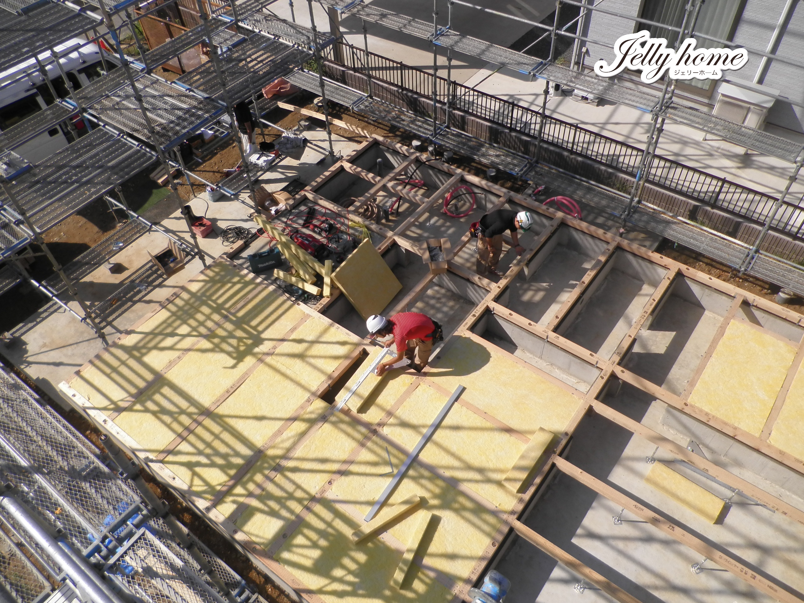 S様邸の土台敷きと床断熱材の充填も捗り、