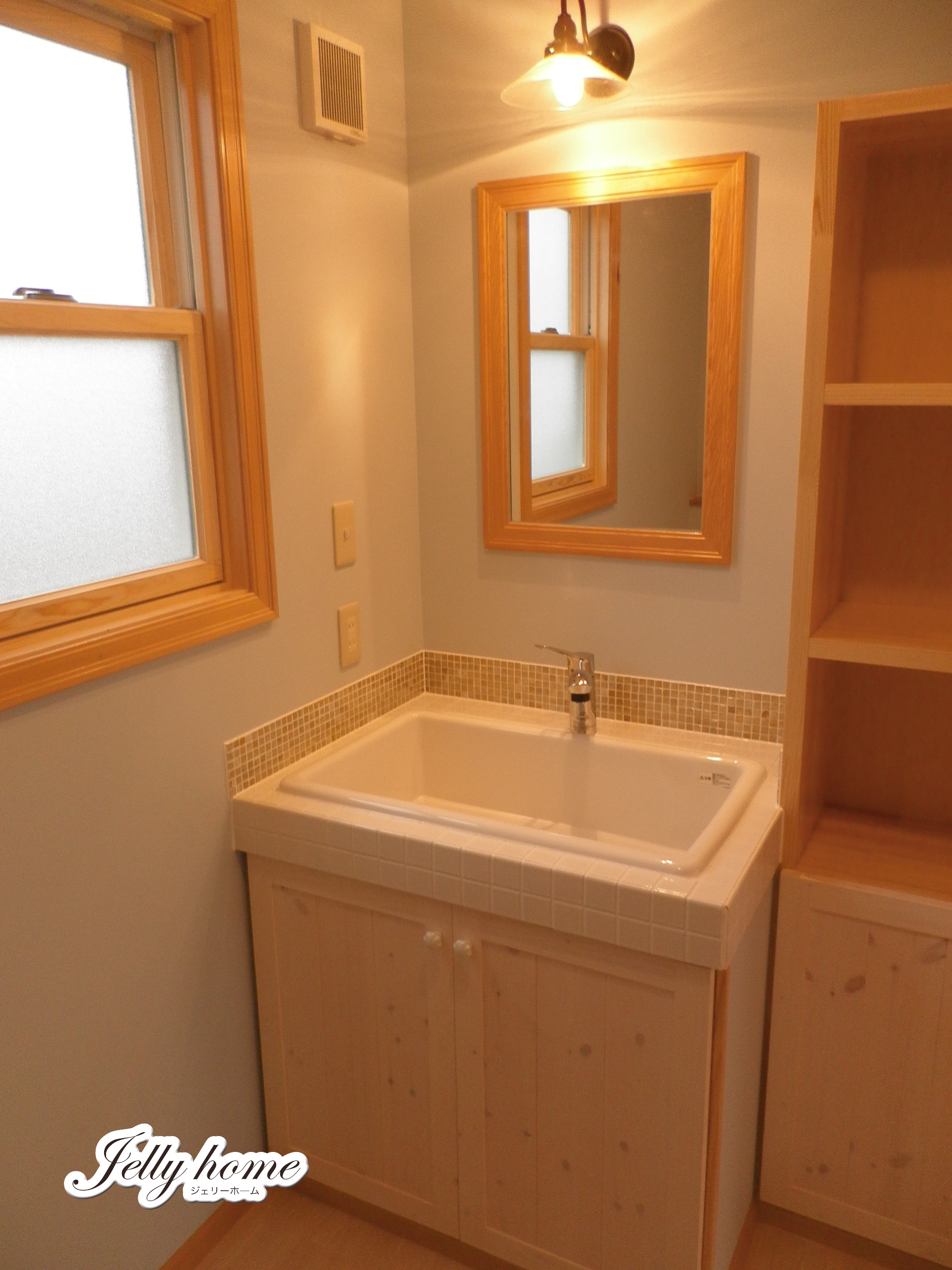 現場で手作りした洗面台は、50角のモザイクタイルを天板に用い、