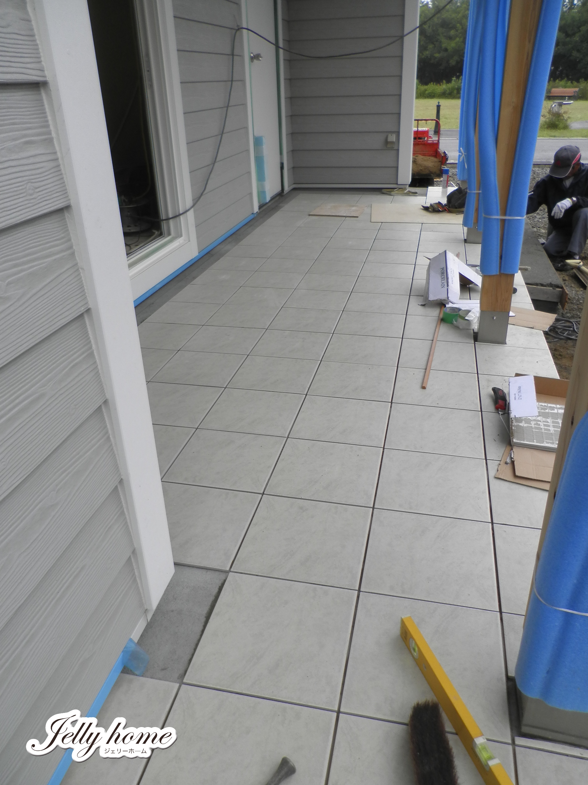 カバードポーチのタイル貼りに入ったK様邸。