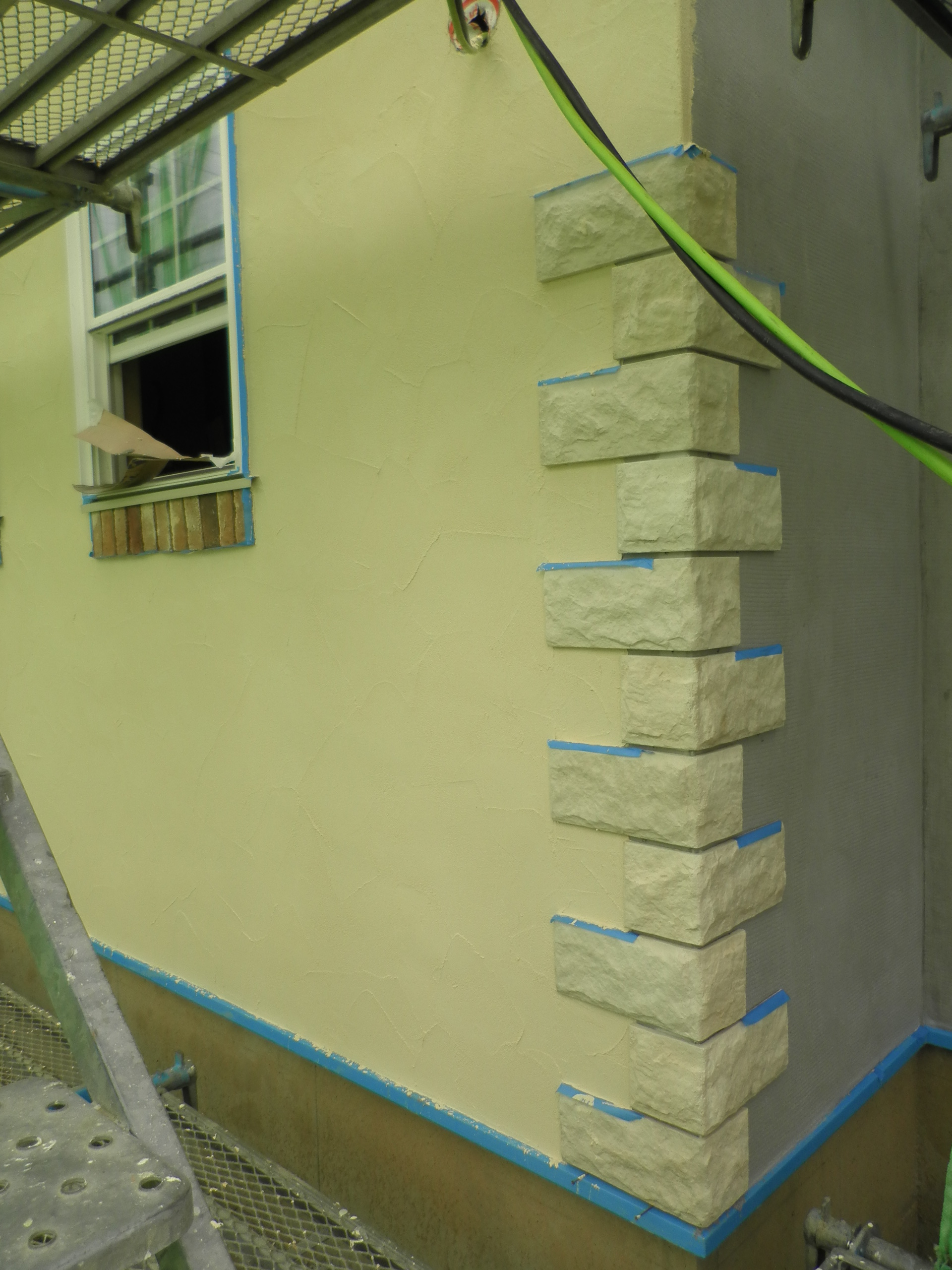 コーナーにはL型石材を貼り付け、窓下にはレンガを埋め込み、