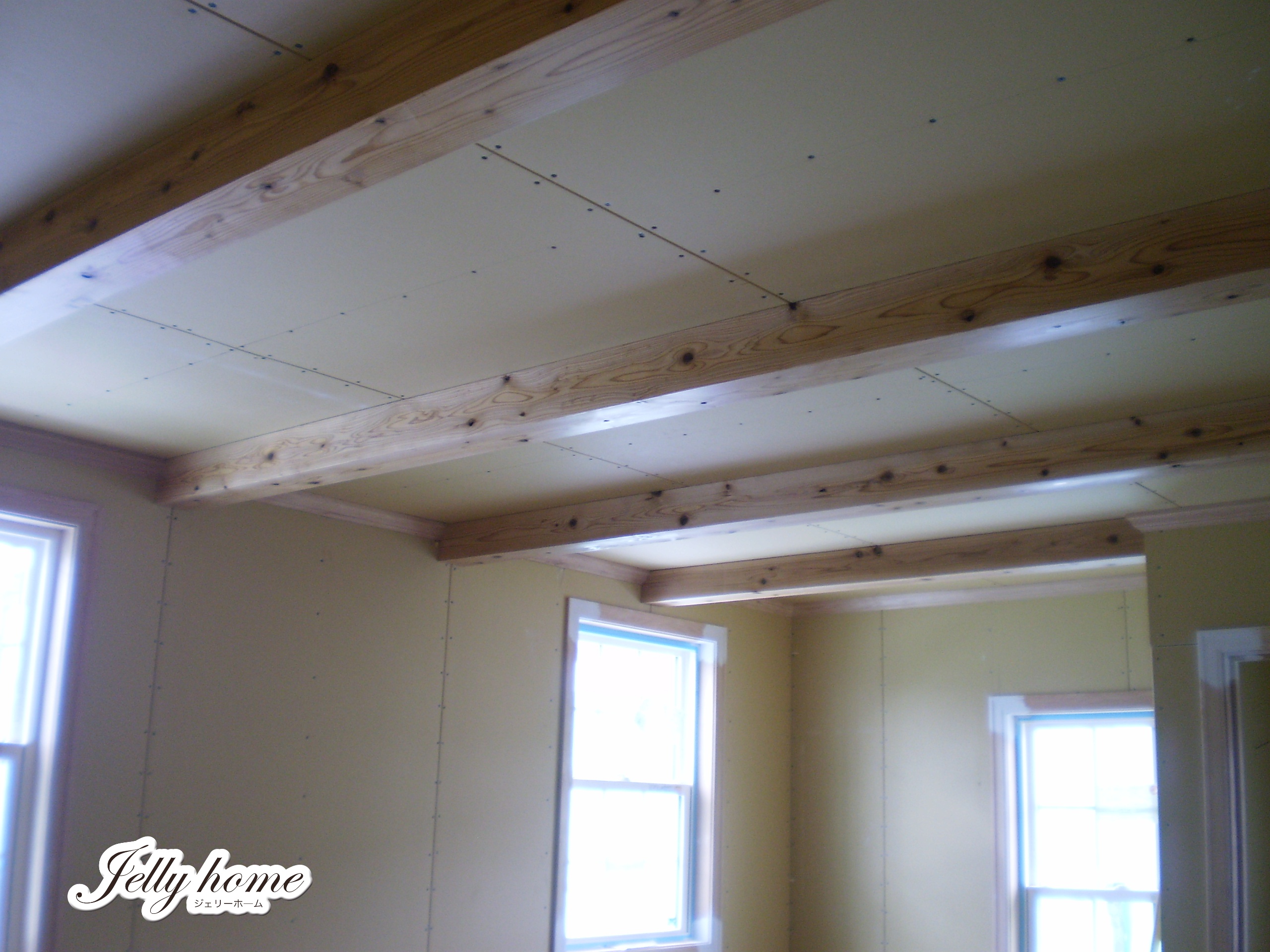 吹抜け天井の化粧梁が取り付けられ、ますます雰囲気が良くなってきた