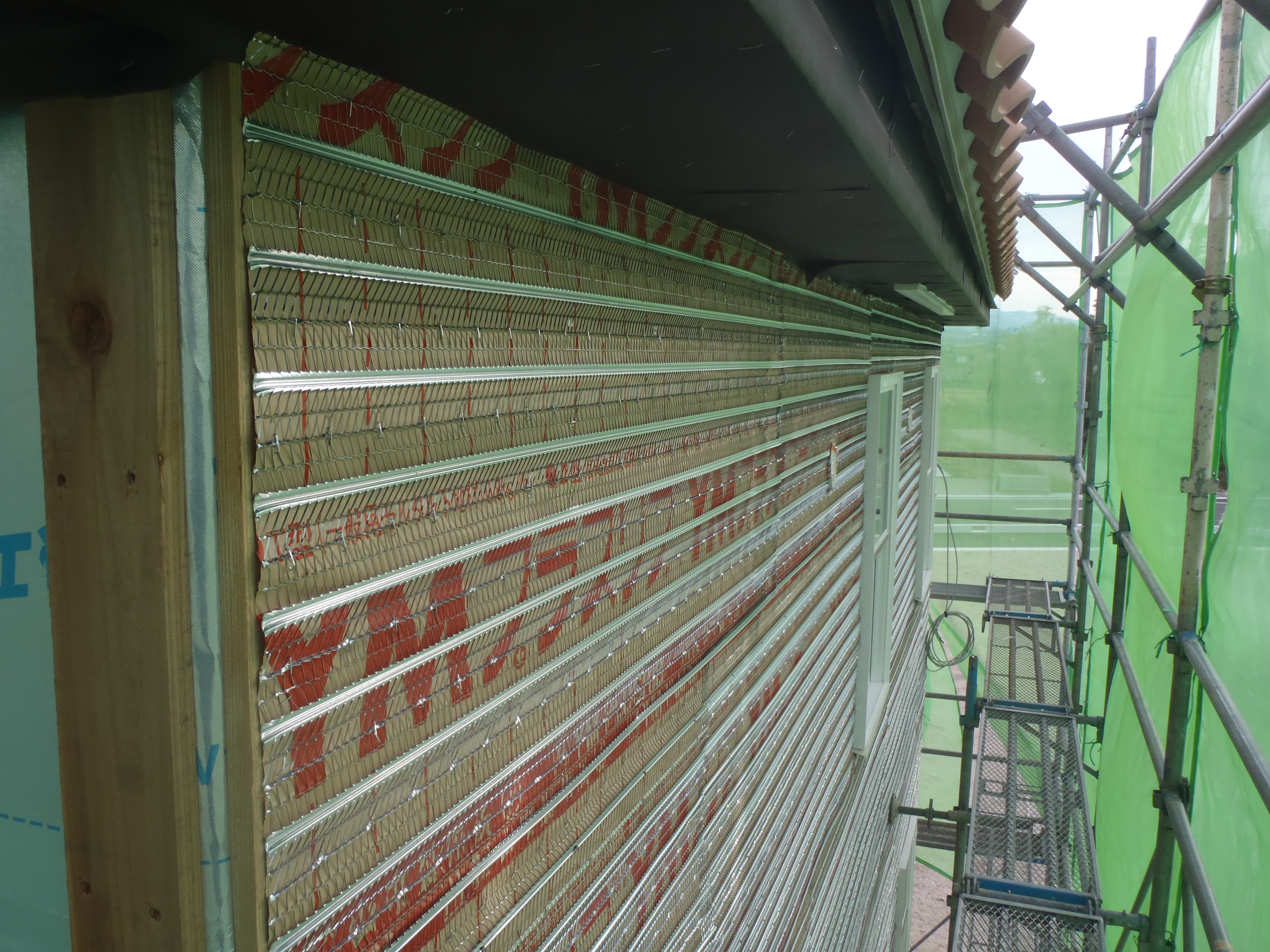 胴縁材の上に貼り付けたリブラスは、モルタルを二重に塗るのには最適な材料。