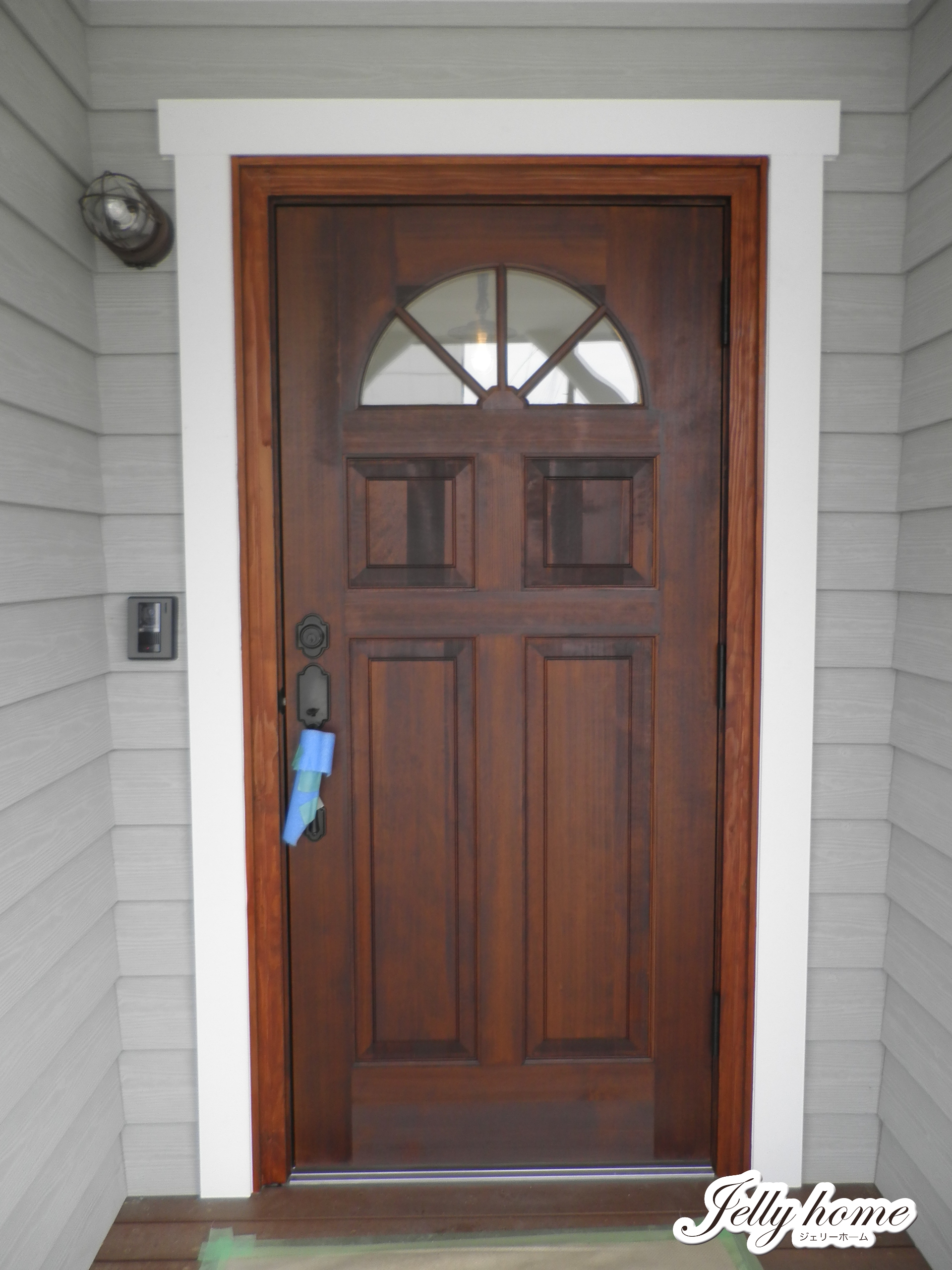 見学会を控えたN様邸の玄関ドアは、シンプソンの半円窓付の木製タイプ。