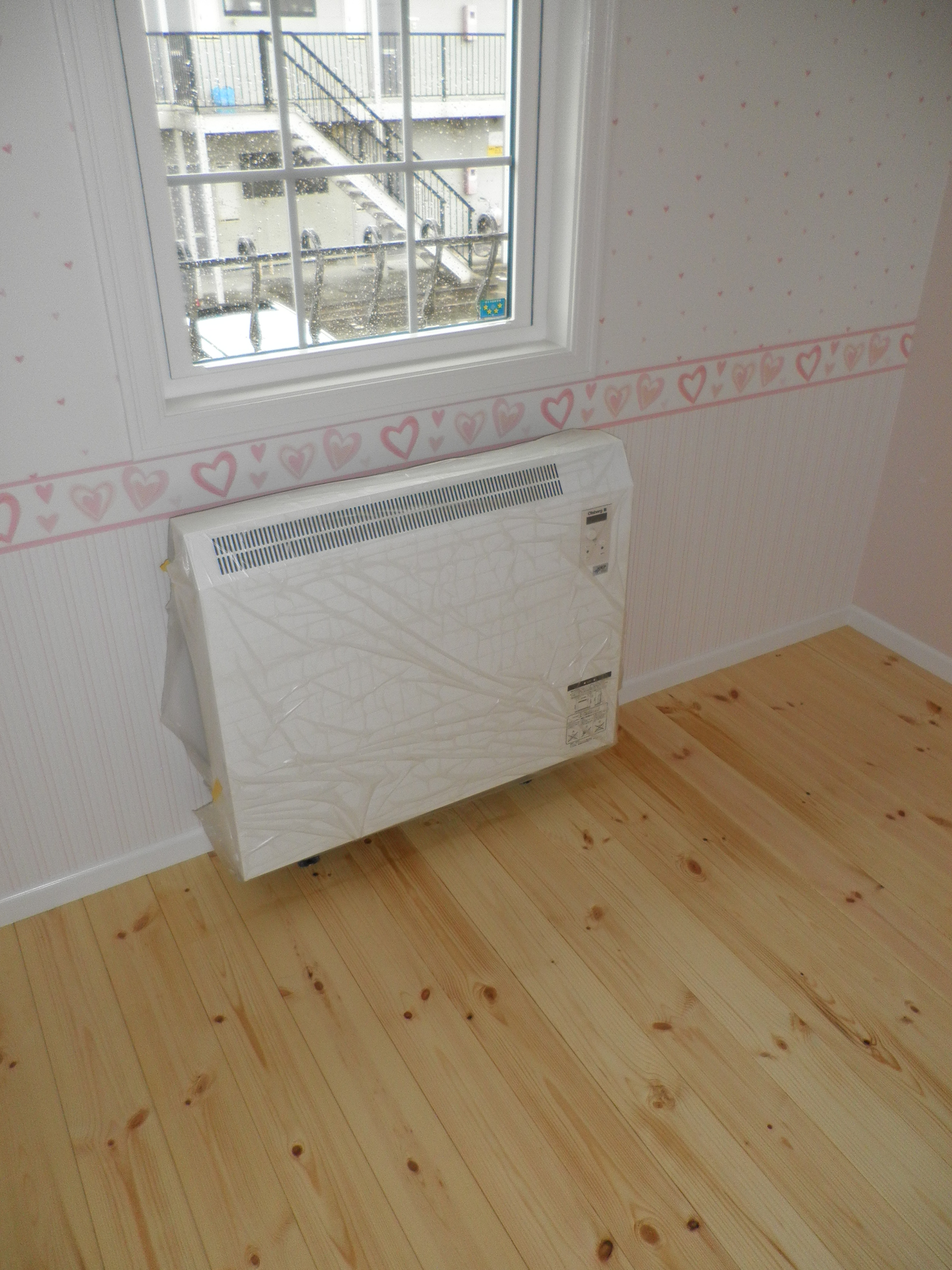 蓄熱暖房機はスリム型なので全然邪魔にならず、リボス塗装仕上げの終わった床に