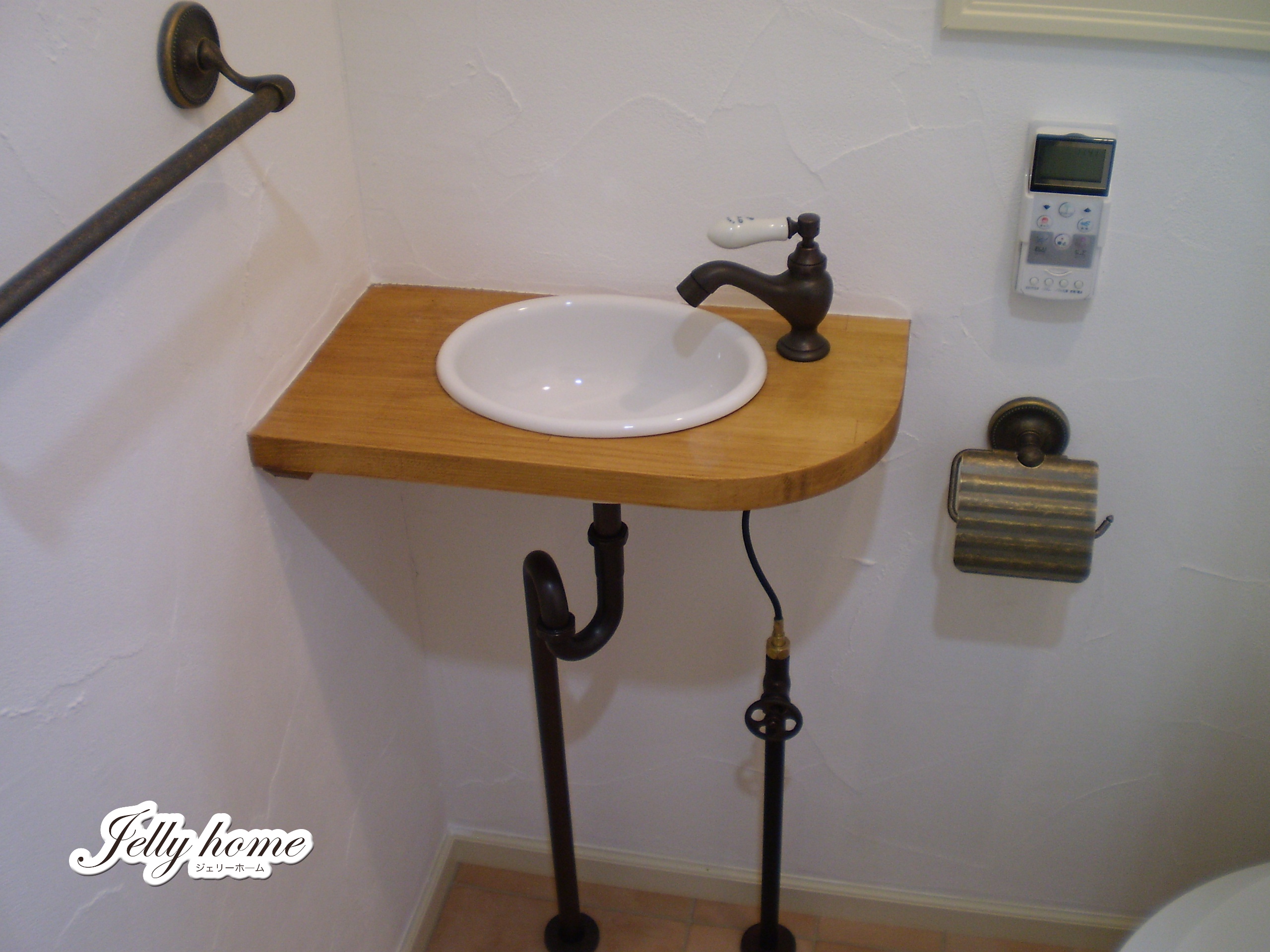 トイレ内に取り付けた手洗い器は、仕入れした輸入部材を組み合わせて