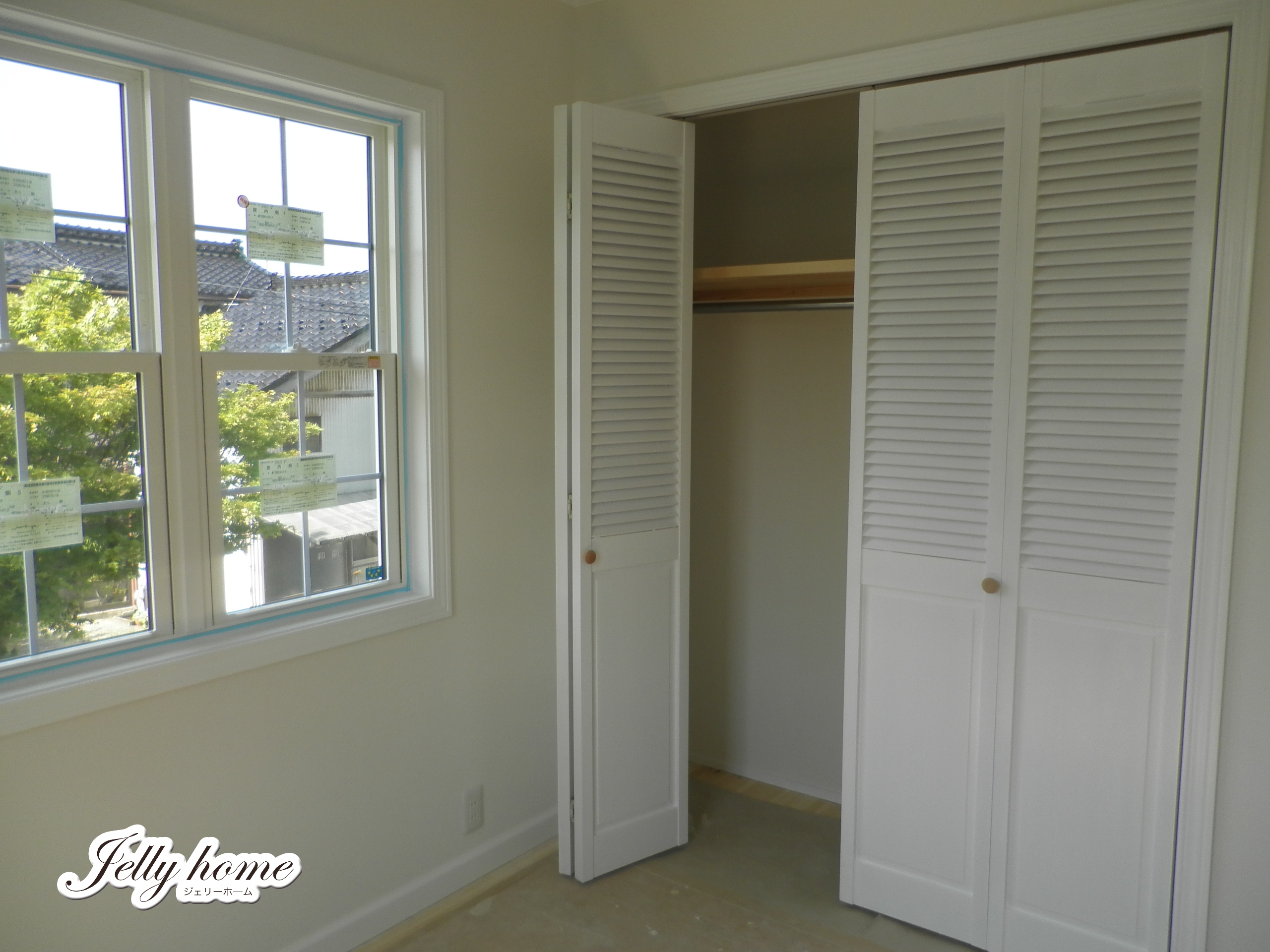 クローゼットの折れ戸はルーバー付にして、白いペイントで仕上げた。