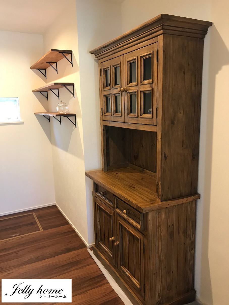 キッチン食器棚は赤松無垢材を使用した