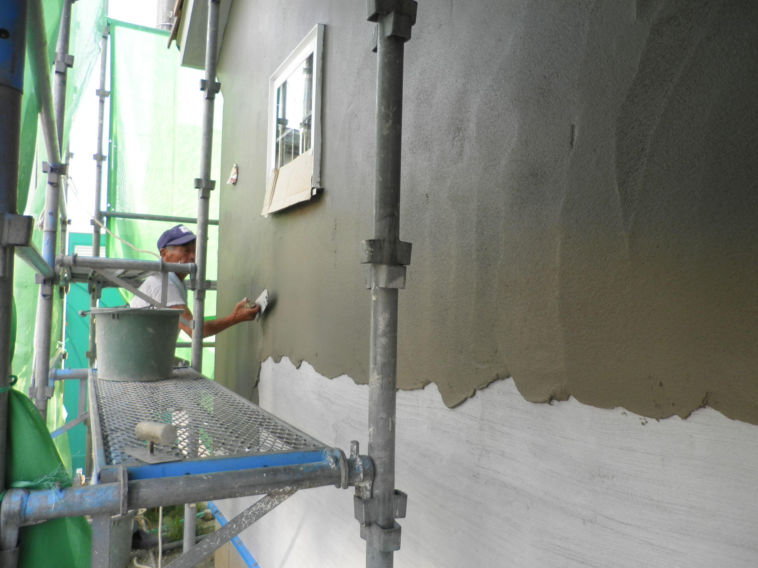 モルタル下地塗りの2回目を施工中で、今日も大変暑い中、職人さん達には御苦労を